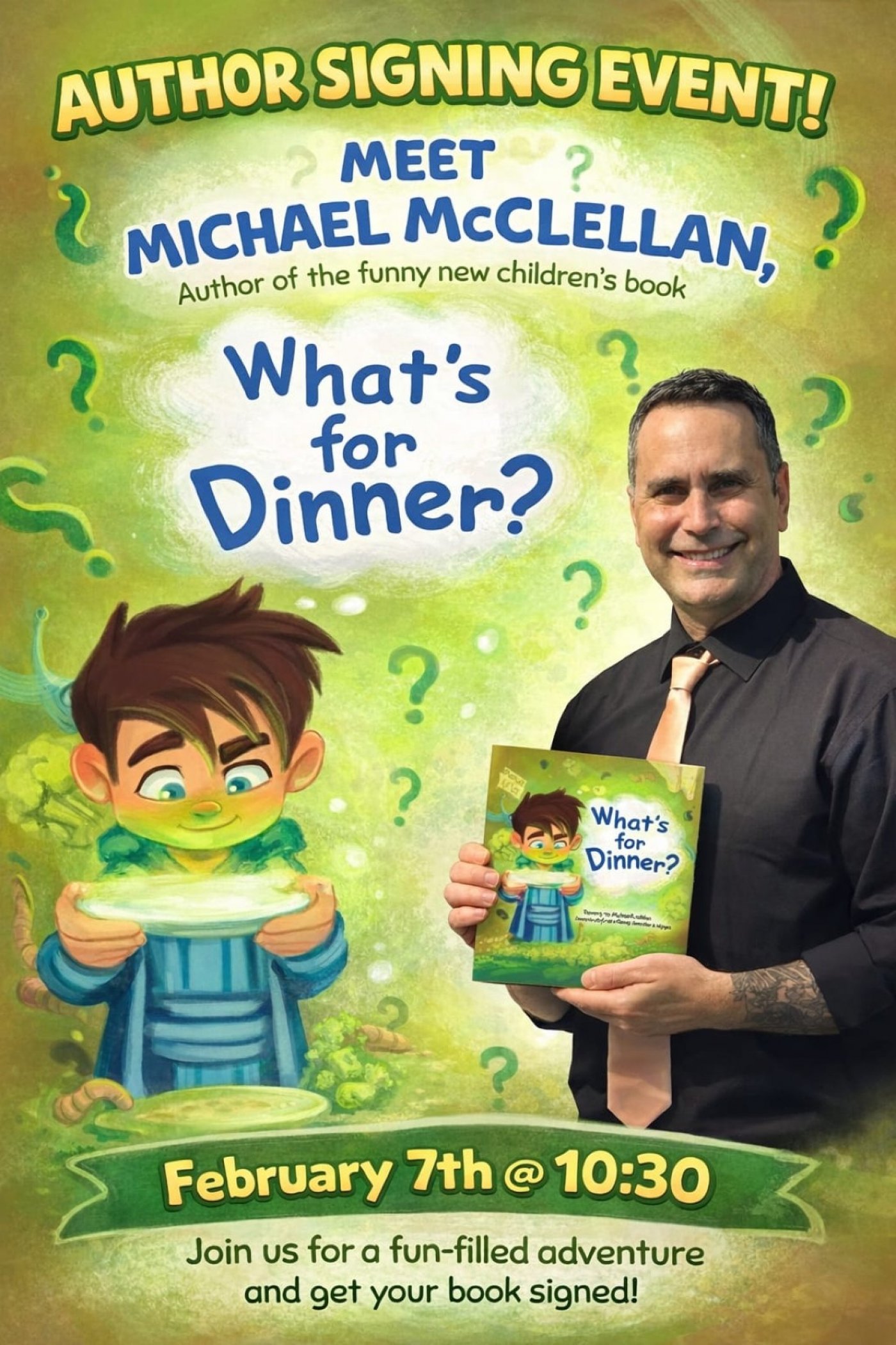 Bring the family on February 7th and meet local children's author Michael McClellan as he reads his debut book, "What's for Dinner?"
