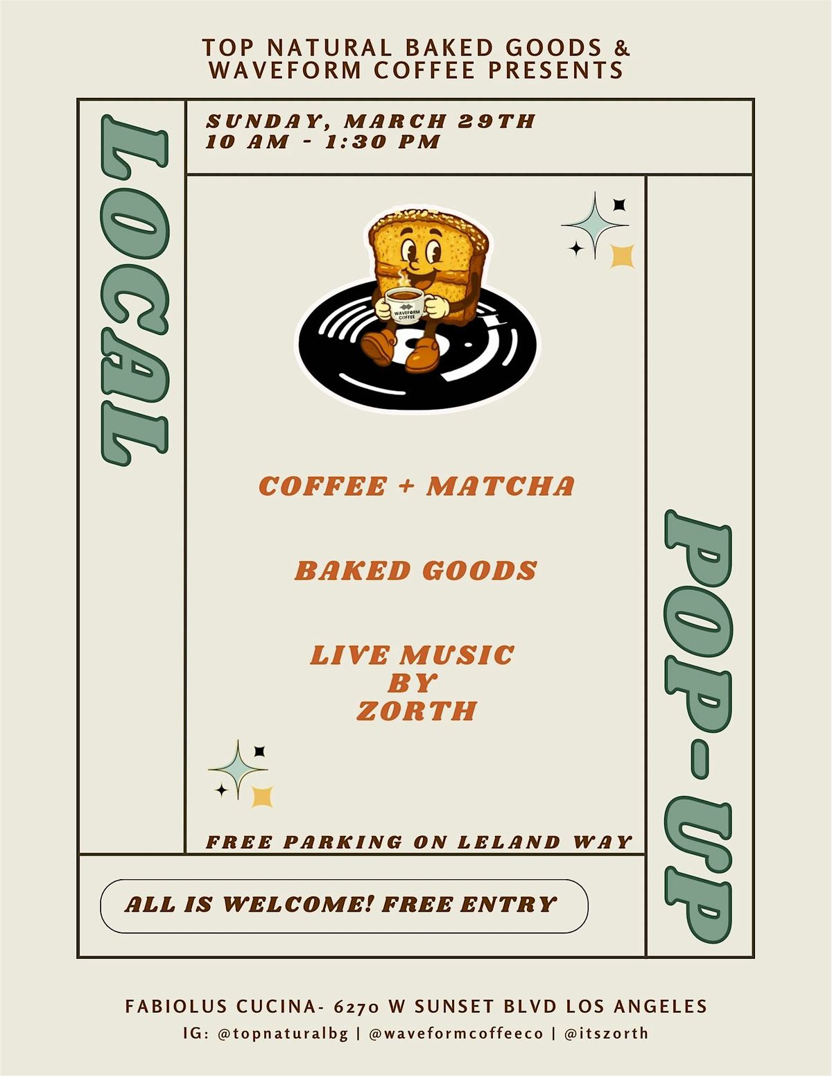 Hey there! Swing by our Local Coffee and Baked Goods Pop Up and treat yourself to some seriously tasty sips and bites while listening to sounds by Zorth. This in-person event is perfect for anyone who loves fresh organic coffee or matcha and delicious organic treats. Bring your friends, grab a cup, and enjoy the cozy vibes while supporting local bakers and roasters. See you there for a fun, chill day packed with flavor!