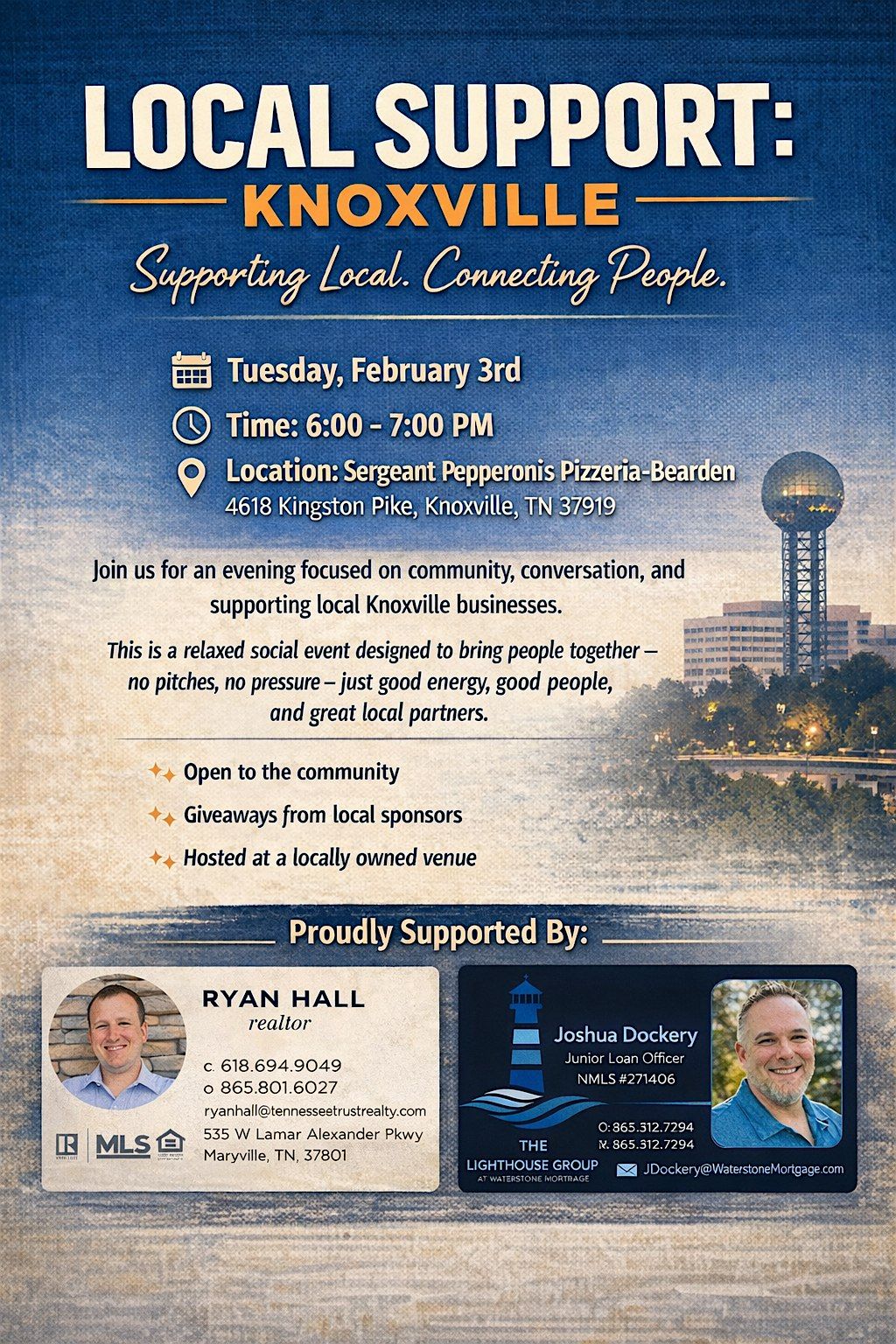 This isn’t a sales event and there’s no pressure — just a chance to meet new people, enjoy a locally owned venue, and connect with others who care about the Knoxville community.