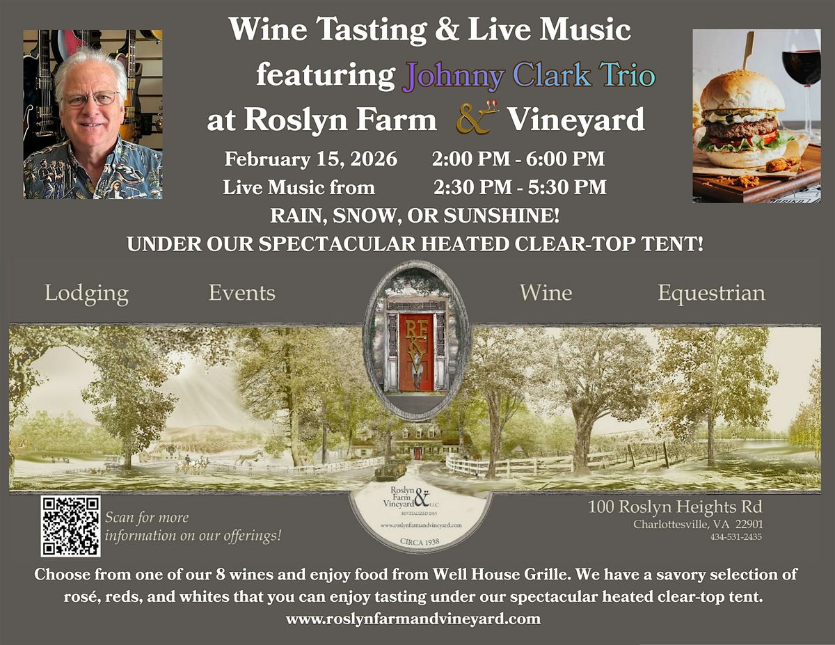 Join us for a delightful afternoon at 100 Roslyn Heights Rd on February 15, 2026 at 2:00 PM (Eastern Time). Sip on exquisite local wines while enjoying the mesmerizing tunes of the Johnny Clarke Trio. It's the perfect blend of music and wine to unwind and have a great time with friends and family. Don't miss out on this fantastic event!