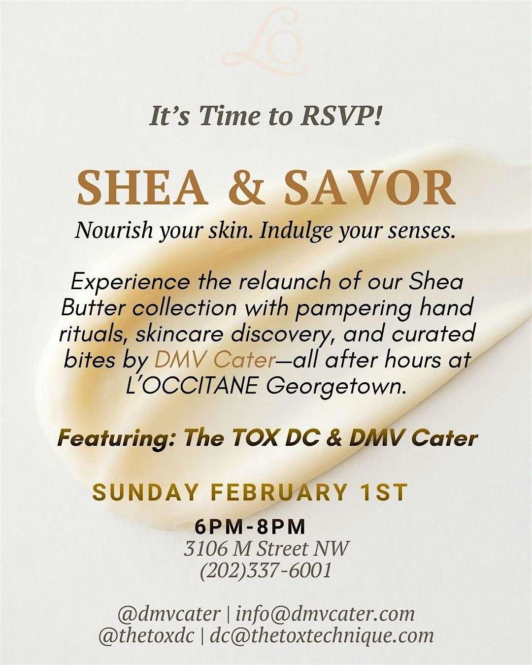 Welcome to L'Occitane Georgetown Presents: Shea & Savor! Join us at 3106 M St NW on February 1, 2026 at 6:00 PM (Eastern Time) for a delightful evening. Indulge in the luxurious world of the new Shea Butter line, relax with a mini consultation by The Tox DC, and savor the essence of Provence with bites by DMV Cater! Let your senses guide you through a journey of relaxation and pampering. Don't miss this opportunity to treat yourself to a unique experience. We can't wait to see you there!