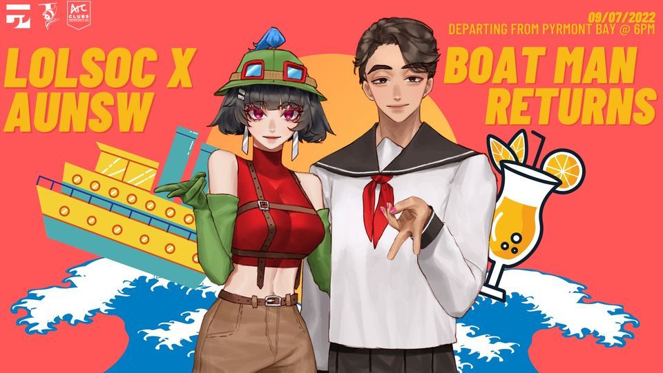Have you been cruising through uni? Well, now its time to cruise with ? LoLSoc ? and ? AUNSW ?!⚓ Boat Man Returns ⚓ is a costume cruise in which we encourage you to dress up subtly as your favourite anime/league characters! If you just want to chill with friends or meet some people on a boat, then that's fine as well!!! Unlike Noah's Ark, we will be accepting more than 2 of everything, so don't hesitate to go even if others might have the same idea as you.
