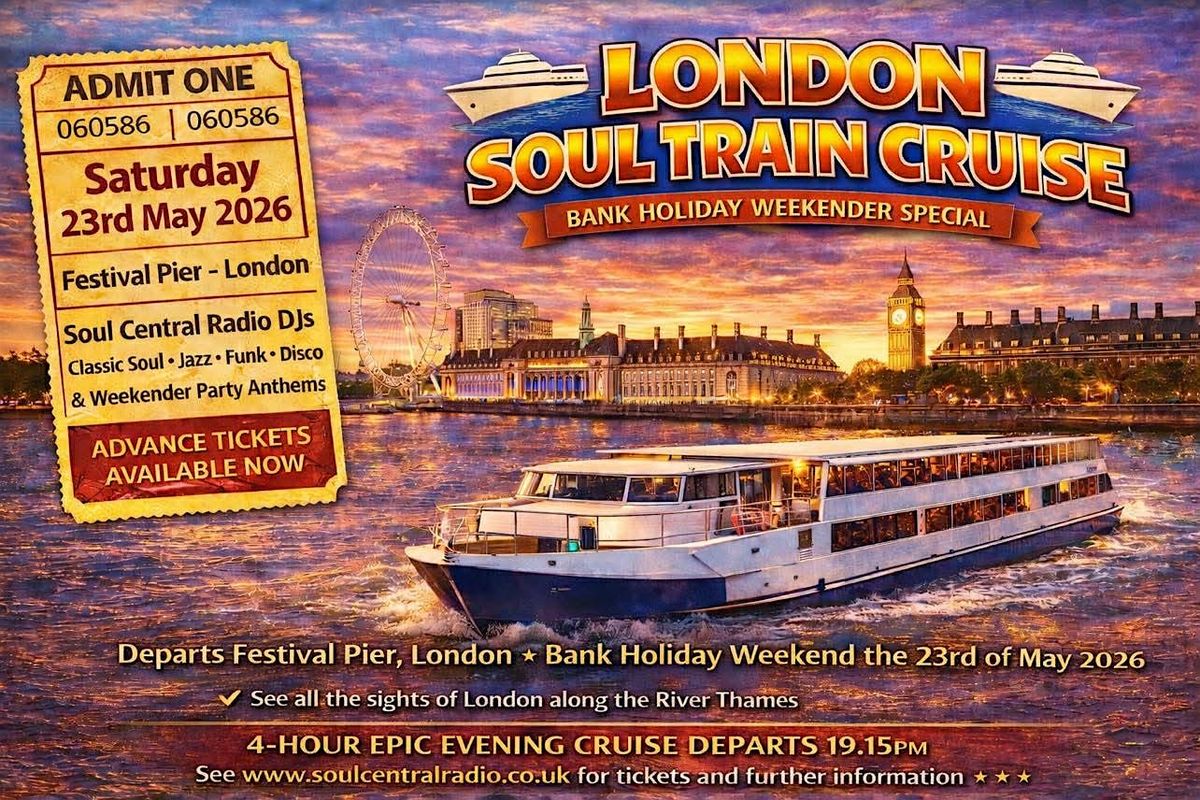 London Soul Train Cruise Spring bank holiday Edition. Come and party with us this May on the No.1 Soul Cruise on the river Thames.. Epic 4 hour evening cruise you will remember for the rest of your life! Get your tickets today to avoid disappointment.. Playing nothing but Classic Soul Jazz funk Disco & Weekender party Anthems all night long. On board the floating Nightclub the M.v Jewel of London. Boading Festival pier London from 7.15pm sharp! Right in the heart of London. FOR A FOUR HOUR EVENING CRUISE. With Soul Central Radio Djs playing all your favourite Soul tunes its going to be a Fantastic night to remember!