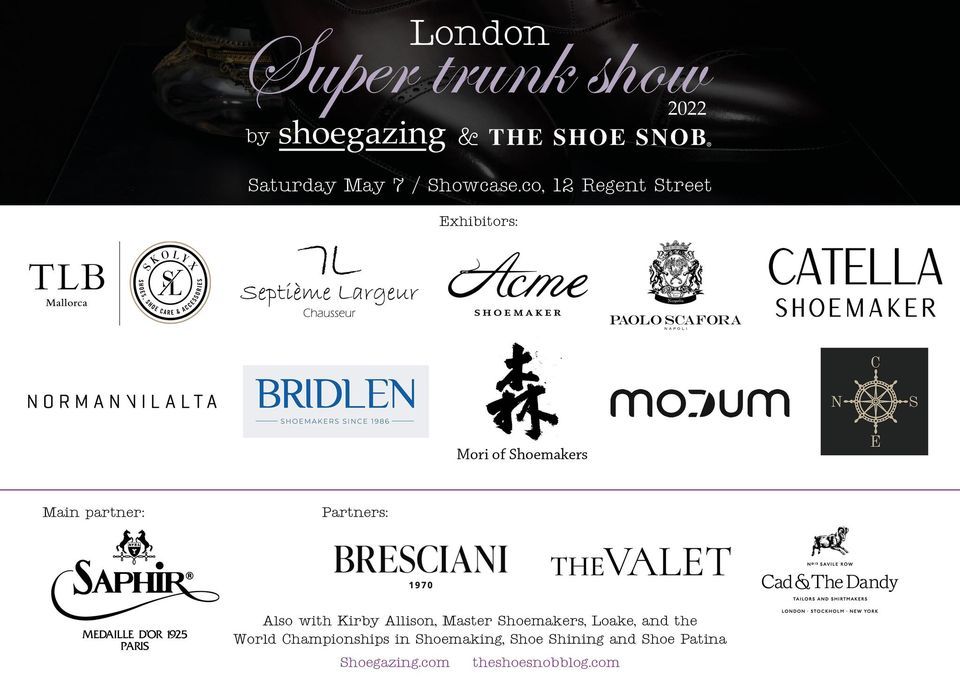 We are happy to once again invite you all to the world’s largest open event for classic shoes, the London Super Trunk Show, organised by Shoegazing and The Shoe Snob. On Saturday May 7 (NEW DATE!), in the middle of London on 12 Regent Street, we gather more than ten brands from all over the world, interesting partners, there will be the World Championships in Shoe Shining and Shoe Patina, plus the World Championships in Shoemaking will have it’s award ceremony and competition shoes displayed.All info about the event can be found here: https://shoegazing.com/2022/02/11/london-super-trunk-show-2022/