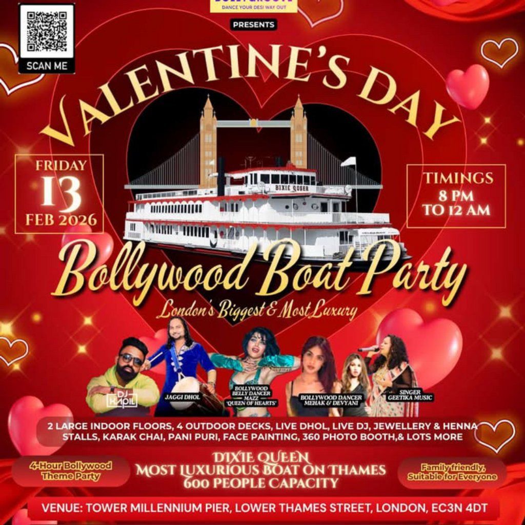London's biggest luxury Valentine's Bollywood boat party-DJ, dancing, skyline views, romance on the Thames. Dress up, vibe hard, love louder.