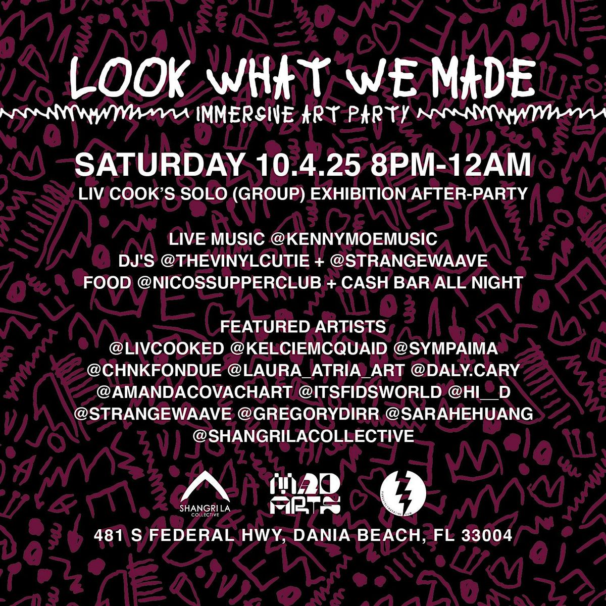 Then join us down the street for the After Party LOOK WHAT WE MADE. This free Immersive Art Party will be from 8pm-12am at Mad Arts located at 481 South Federal Highway