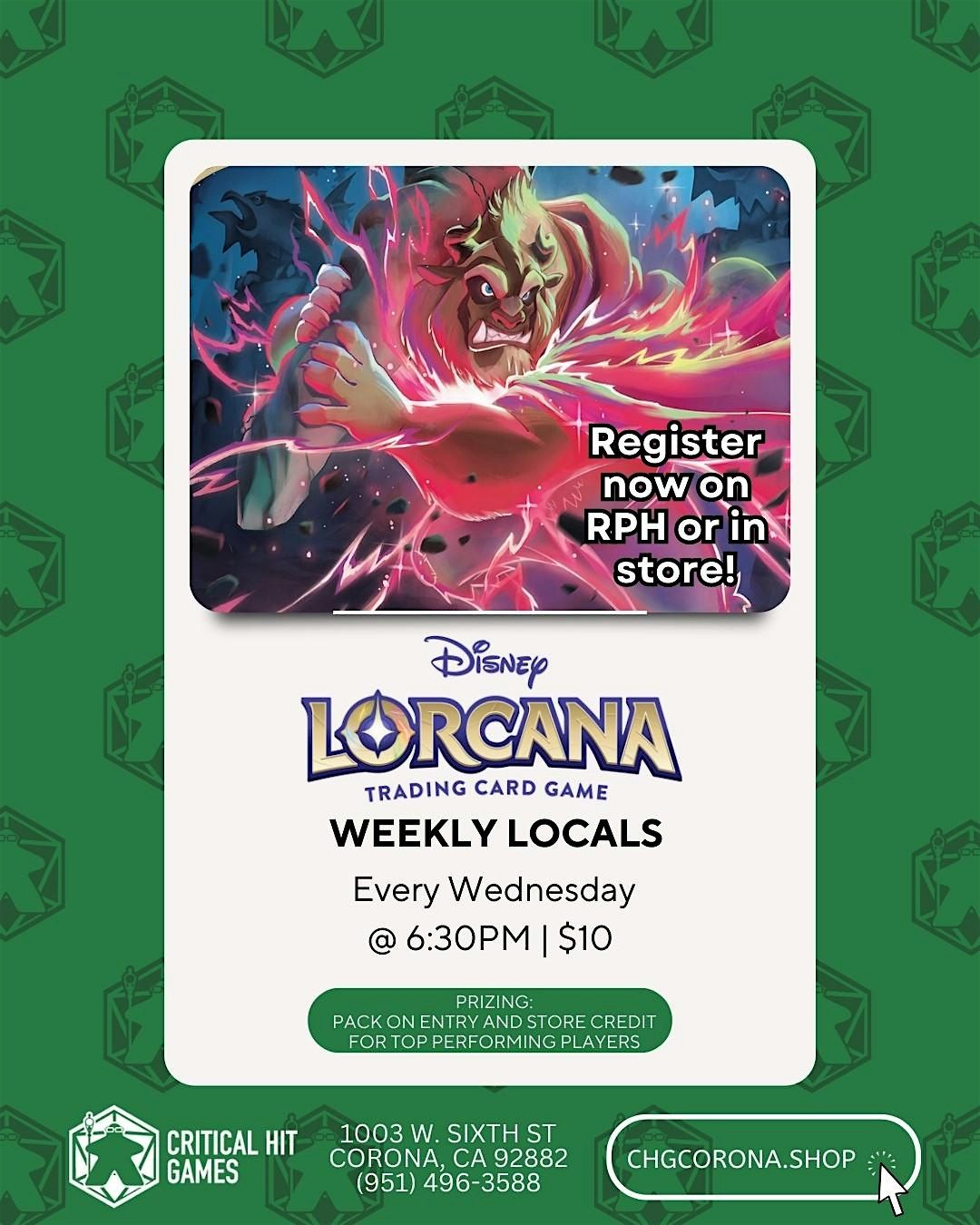 Lorcana Night returns today, and every Wednesday, at 6:30 PM at Critical Hit Games! Entry is just $10 for core constructed play, and every player receives a pack for joining. Store credit goes out to top performers, making it a great mix of fun and friendly competition.