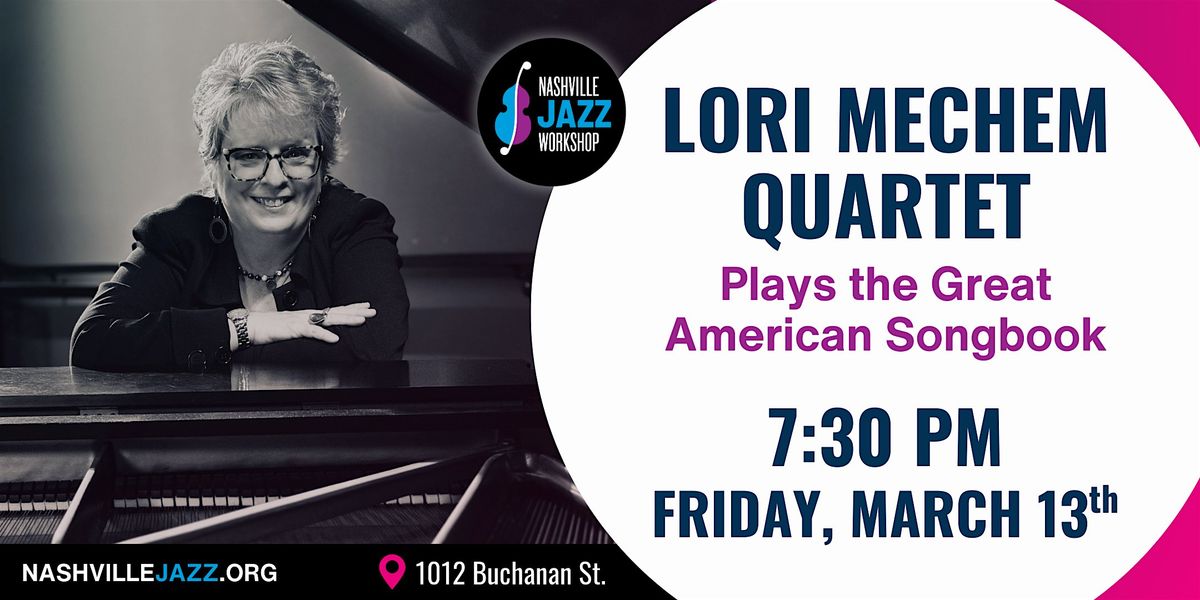 Join the Lori Mechem Quartet for an evening of the timeless music of the Great American Songbook on Friday, March 13th, at 7:30 PM at the Nashville Jazz Workshop. A respected jazz pianist, composer and educator, Lori, along with her husband Roger Spencer, has been living in the Nashville area since 1988. Together they founded the Nashville Jazz Workshop, helping pave the way for Nashville’s jazz scene to become what it is today. In addition to directing production shows and conducting musical theater, she has performed with artists such as Dizzy Gillespie, Red Holloway, Jimmy Smith, Cal Collins, Roy McCurdy, Terry Gibbs, Pete Christlieb, Ed Thigpen, Houston Person, Kevin Mahogany, Everett Greene, Kirk Whalum, Anthony Wilson, Oscar Castro Neves, Bobby Millitello, Marvin Stamm, Ann Jillian, Edie Gorme and the McGuire Sisters. A longtime fixture in the growing Nashville jazz scene, Lori returns to the Jazz Cave with her swinging quartet alongside bassist Roger Spencer, guitarist Andy Reiss, and drummer Chris Brown.