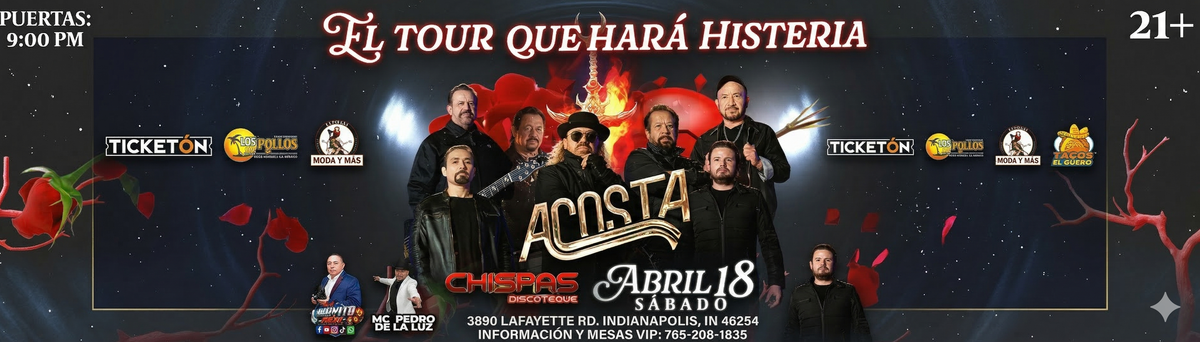 Experience the exciting event 'LOS ACOSTA ' at Chispas Discoteque, Indianapolis, IN, United States. This must-attend gathering promises an unforgettable experience for all attendees. Join us for a day filled with innovation, networking, and inspiration. Claim your ticket to be at the forefront of exciting innovation. #LOSACOSTA #event #exciting #IndianapolisEvents #INEvents