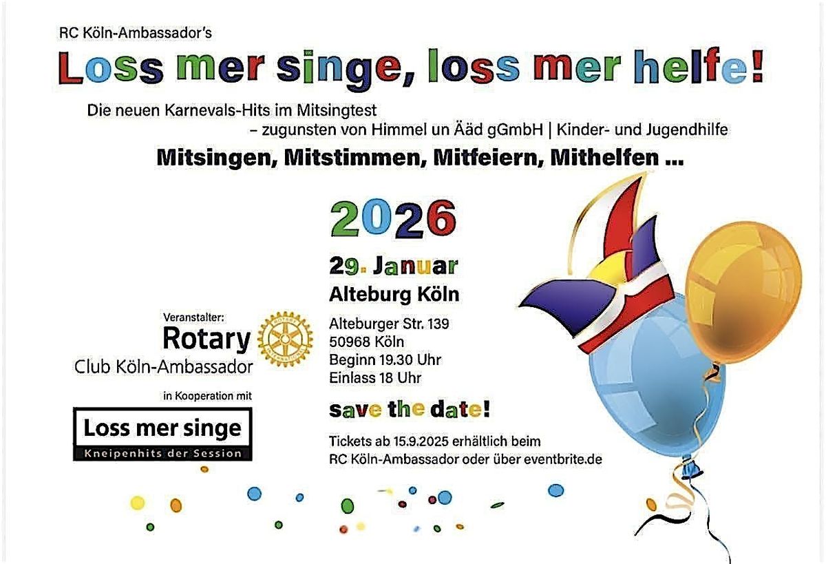 “Loss mer singe” trifft auf Rotary – und gemeinsam laden wir euch herzlich ein zu einem unvergesslichen Abend voller kölscher Tön, guter Stimmung und echtem Zusammenhalt!