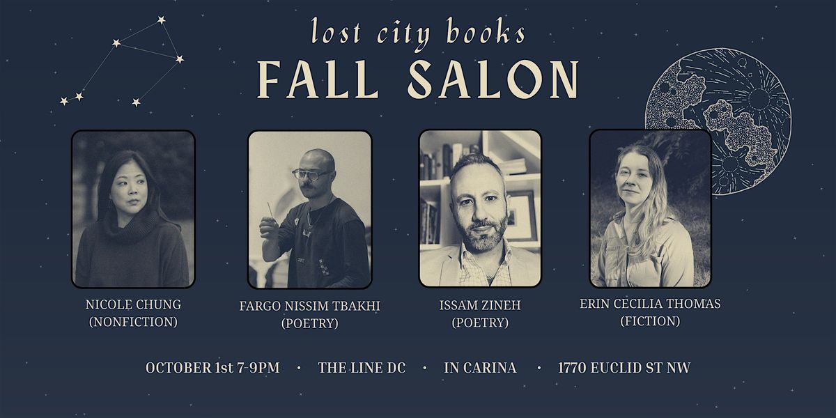 Lost City Books + The Line DC welcome you to attend our Fall Salon, part of a quarterly reading series where we invite talented authors doing exciting work in all different genres to join us and read aloud a piece of their choosing. We'll eat, drink, talk, and listen, meet fellow lovers of literature, discover new authors, and mark the changing of the seasons together.