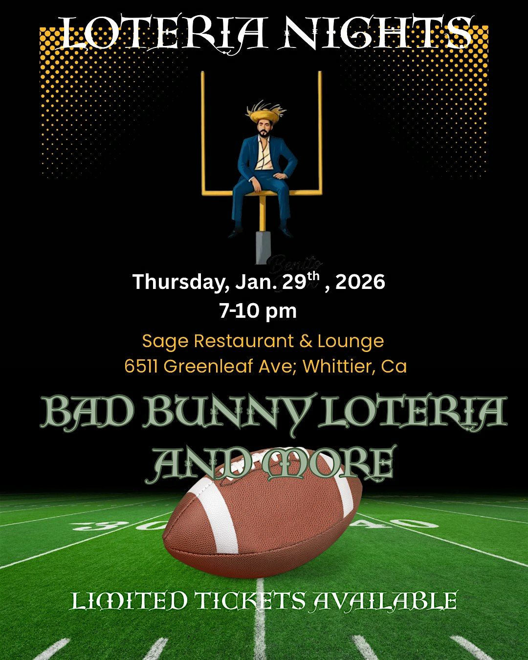 Welcome to Loteria Nights!! We are hosting a super exclusive Bad Bunny Loteria event at Sage Lounge in Uptown Whittier. Thursday, Jan. 29th from 7-10pm join us for a fun event of Bad Bunny Loteria games, Bad Bunny trivia, Vendors with Bad Bunny merchandise, food, specialty drinks and lots of fun. We will have some fun raffles all donated by the vendors that will be in attendance, so go out and visit their booths to win tickets for the raffle. We will have some fun Bad Bunny trivia competitions, and some other fun Bad Bunny activities. As well as a live dj playlist all Benito’s top hits!