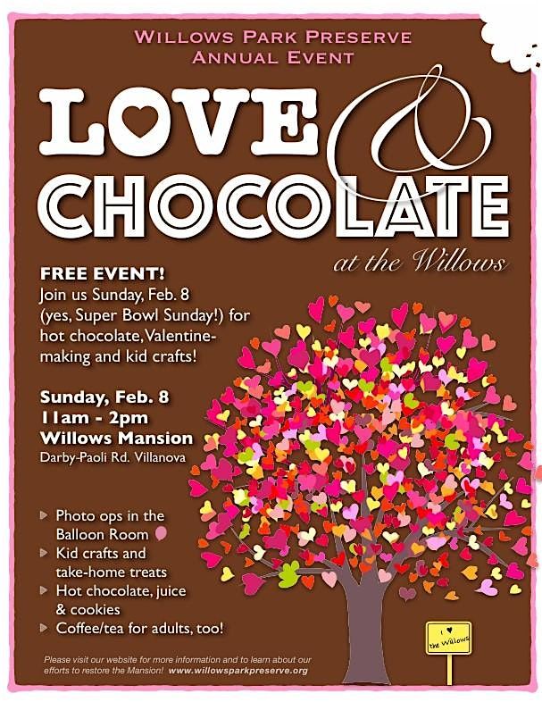 Join us at the Willows Mansion on Sunday, February 8th (yes, super bowl Sunday) for our annual family-friendly Valentine's Day celebration: Love & Chocolate.