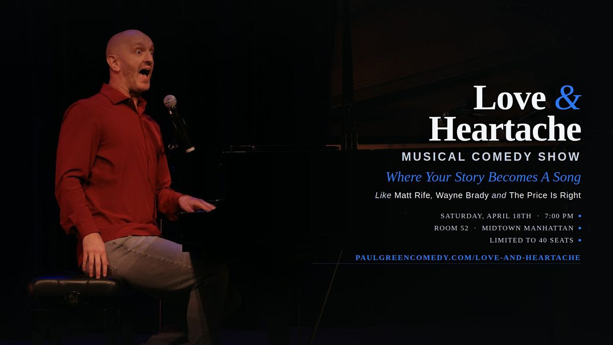 Paul Green has nearly 3,000 live performances across stand-up, musical theater, and improv comedy. Trained at iO West, Second City, and UCB, he has spent years turning strangers' lives into songs. He's getting better at it. The strangers keep getting weirder.