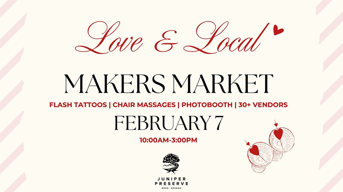 Juniper Preserve's Love & Local Makers Market welcomes everyone to join us for a day of shopping local and sharing the love for the Central Oregon community! Shop for your loved ones or practice some self-love with curated gifts from over 30 vendors in addition to a professional photo booth, flash tattoos from Blade & Ink, chair massages and more from Juniper Spa, and tasty Valentine's mocktails. Plus, the first 15 guests will receive a FREE goodie bag. Mark your calendars now, you won't want to miss this love affair!