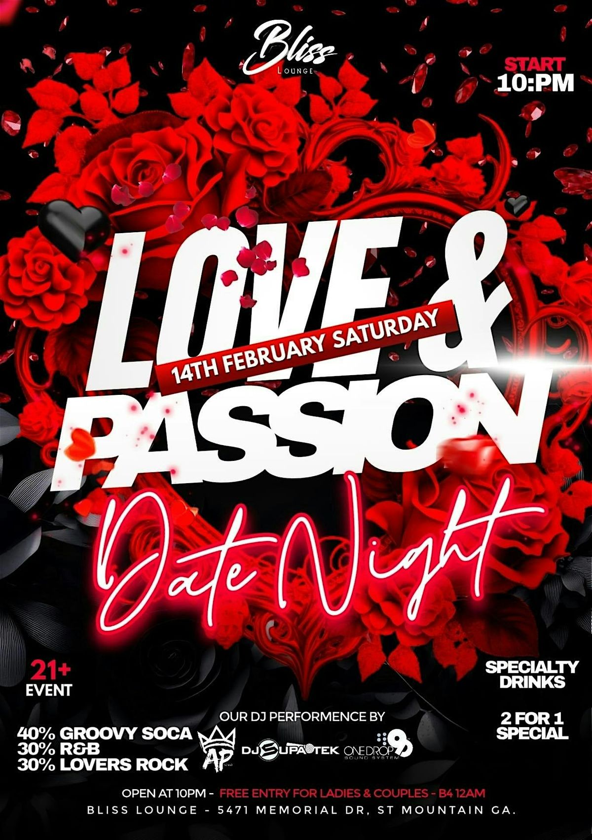 Welcome to Love & Passion! Join us at Bliss Lounge on February 14, 2026 at 10:00 PM for a night filled with romance and excitement. Get ready to celebrate love in all its forms with great music, delicious drinks, and amazing company. Let's create unforgettable memories together! Don't miss out on this special evening! Atlanta's Hottest DJ's King AP, DJ Supa Tek and One Drop Sounds spinning R&B, Lovers Rock and Soca all night long