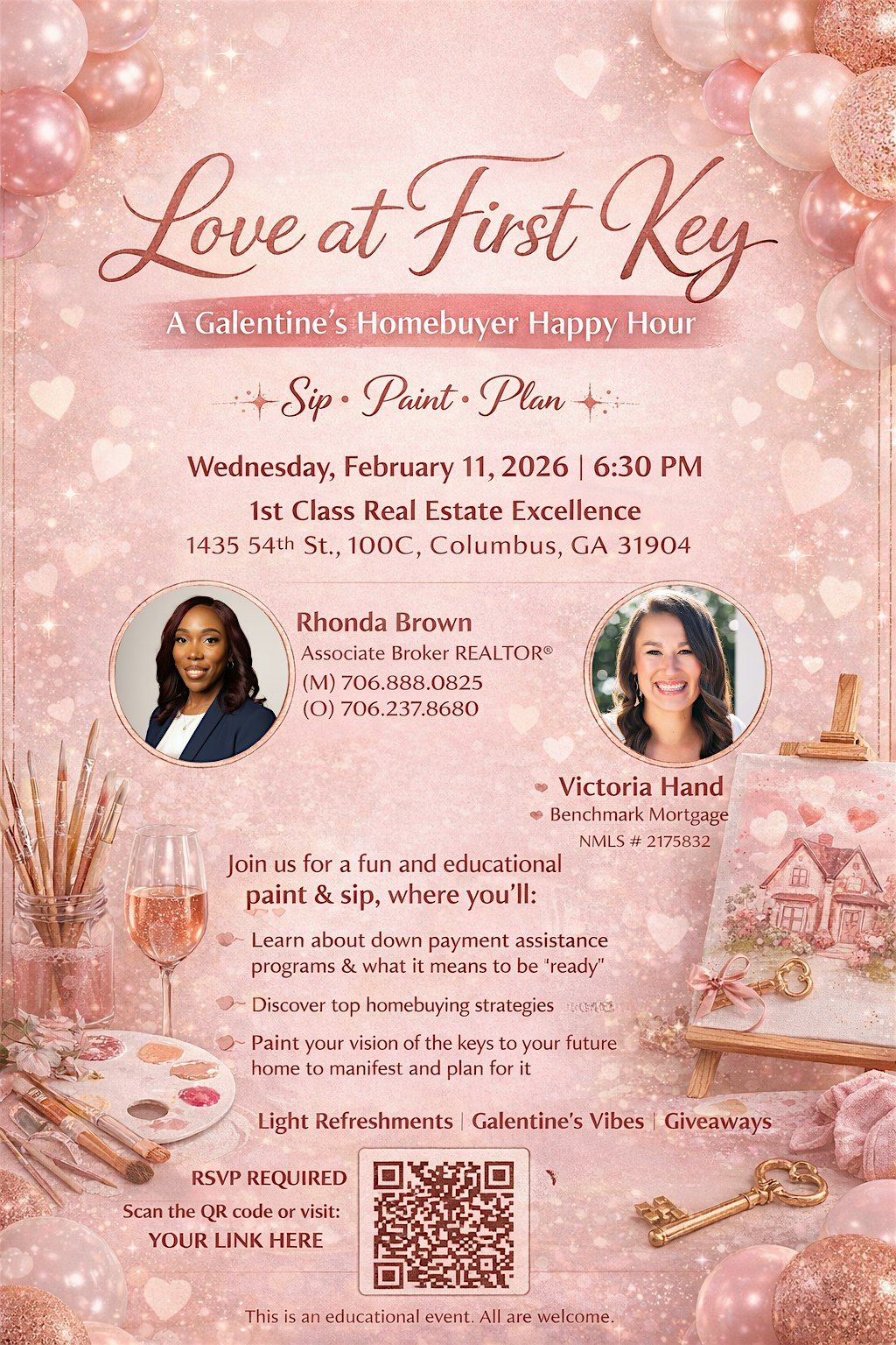 Love at First Key is a Galentine’s-inspired homebuyer happy hour designed to create a relaxed, welcoming space where education meets creativity. This is a paint-focused experience, paired with practical homebuying guidance to help you move from dreaming to planning.