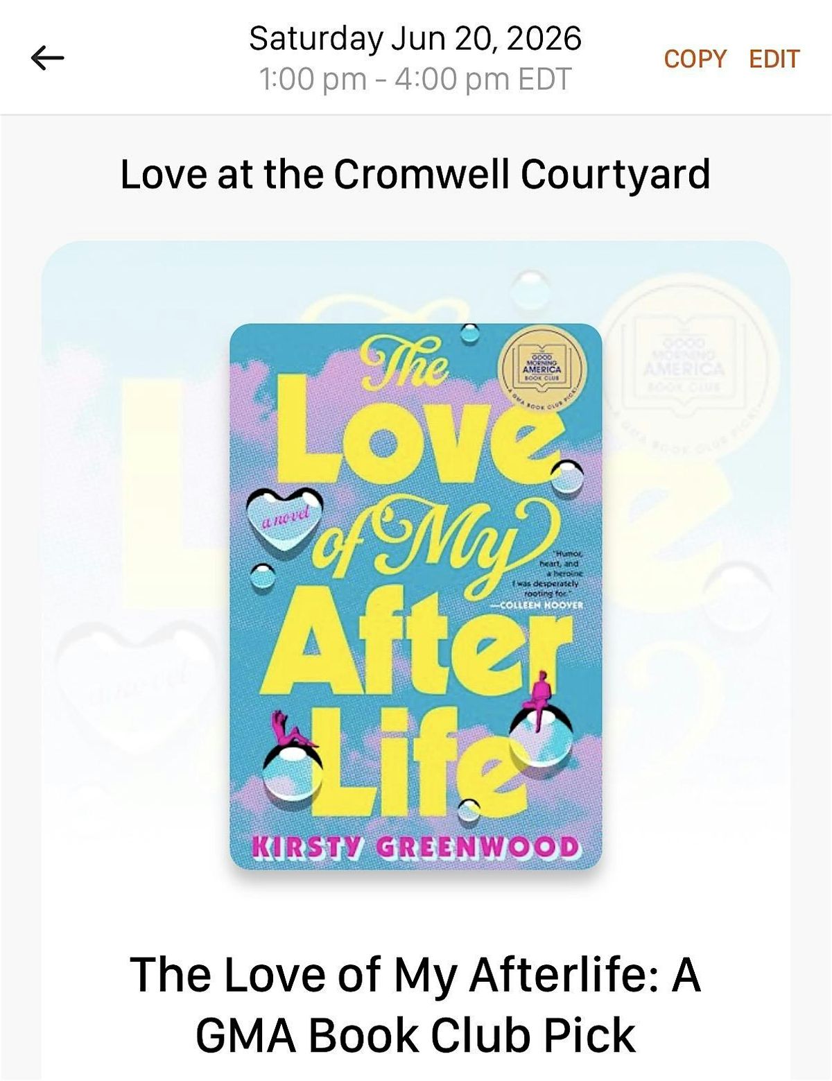 Come discuss The Love of My Afterlife with us at the Cromwell Marriott Conference room. There will be treats and tea waiting for you.