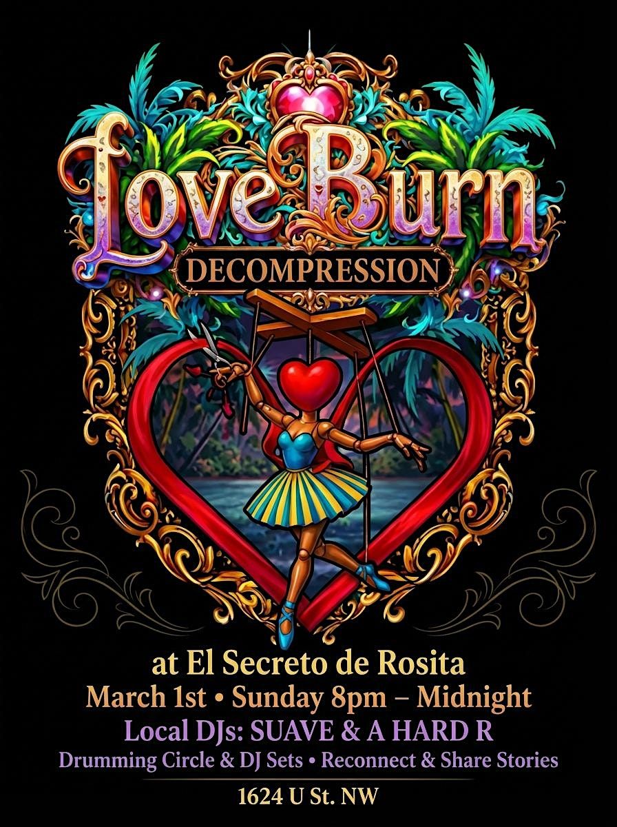 Step out of the dust and into connection. Join us for an intimate Love Burn Decompression gathering in the heart of DC — a space to share memories, reconnect with fellow burners, and welcome those curious about the magic of Love Burn.