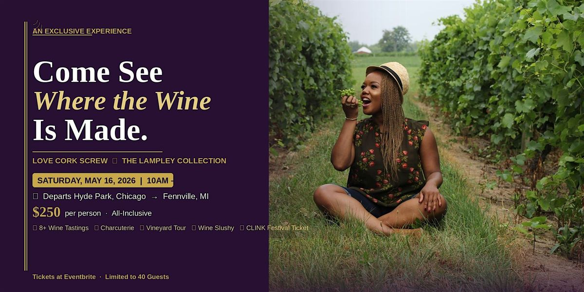 Join us for an exclusive all-inclusive vineyard tour to Fennville, Michigan, the home of Love Cork Screw and The Lampley Collection wines. We're loading up a luxury bus from Hyde Park and taking you behind the scenes for a day you won't forget.