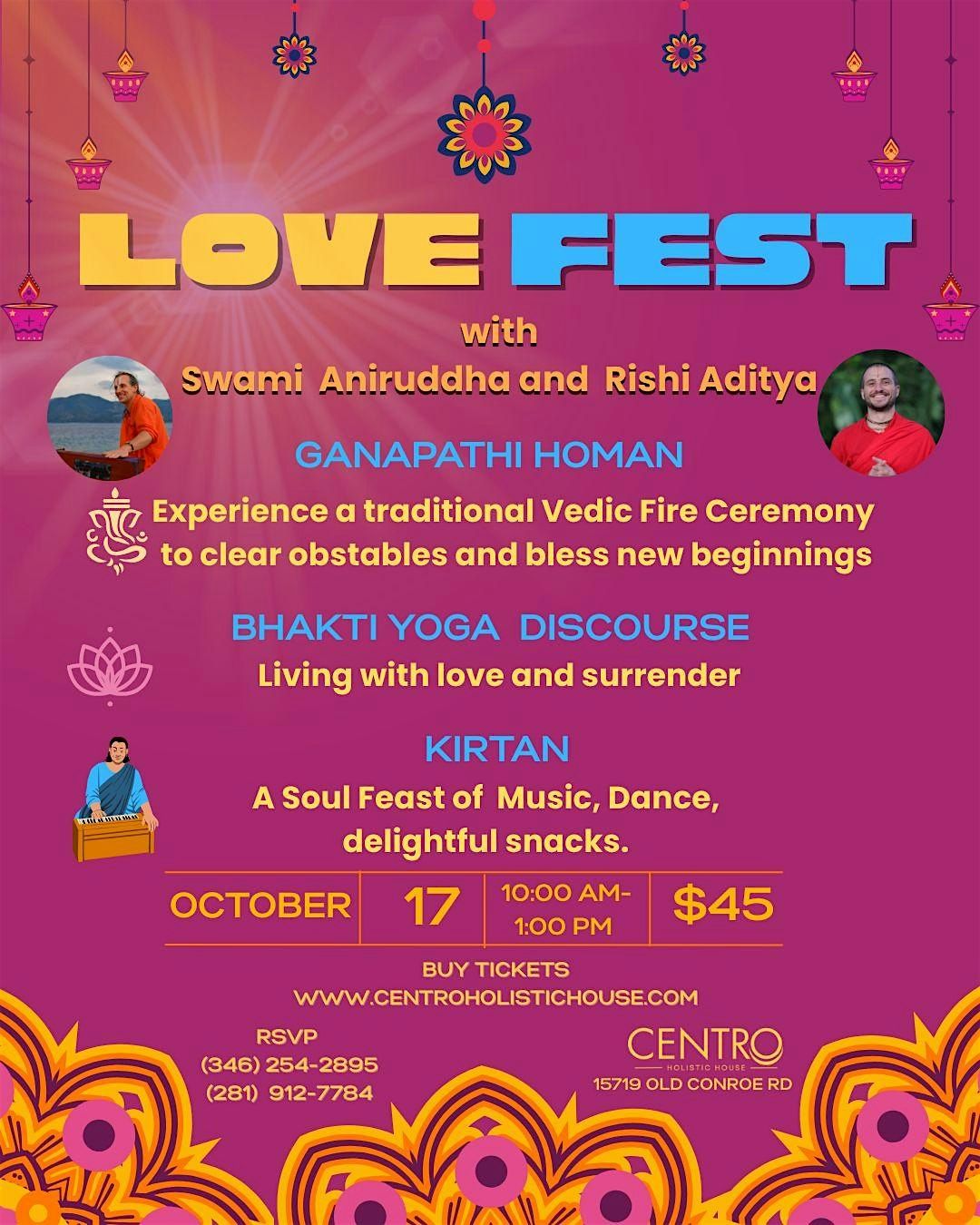Welcome to the Just Love Fest happening at CENTRO Holistic House on October 17, 2025 at 10:00 AM (Central Time)! Join us for a day filled with love, laughter, and positive vibes. Don't miss out on this opportunity to connect with like-minded individuals and spread love in the community. See you there!