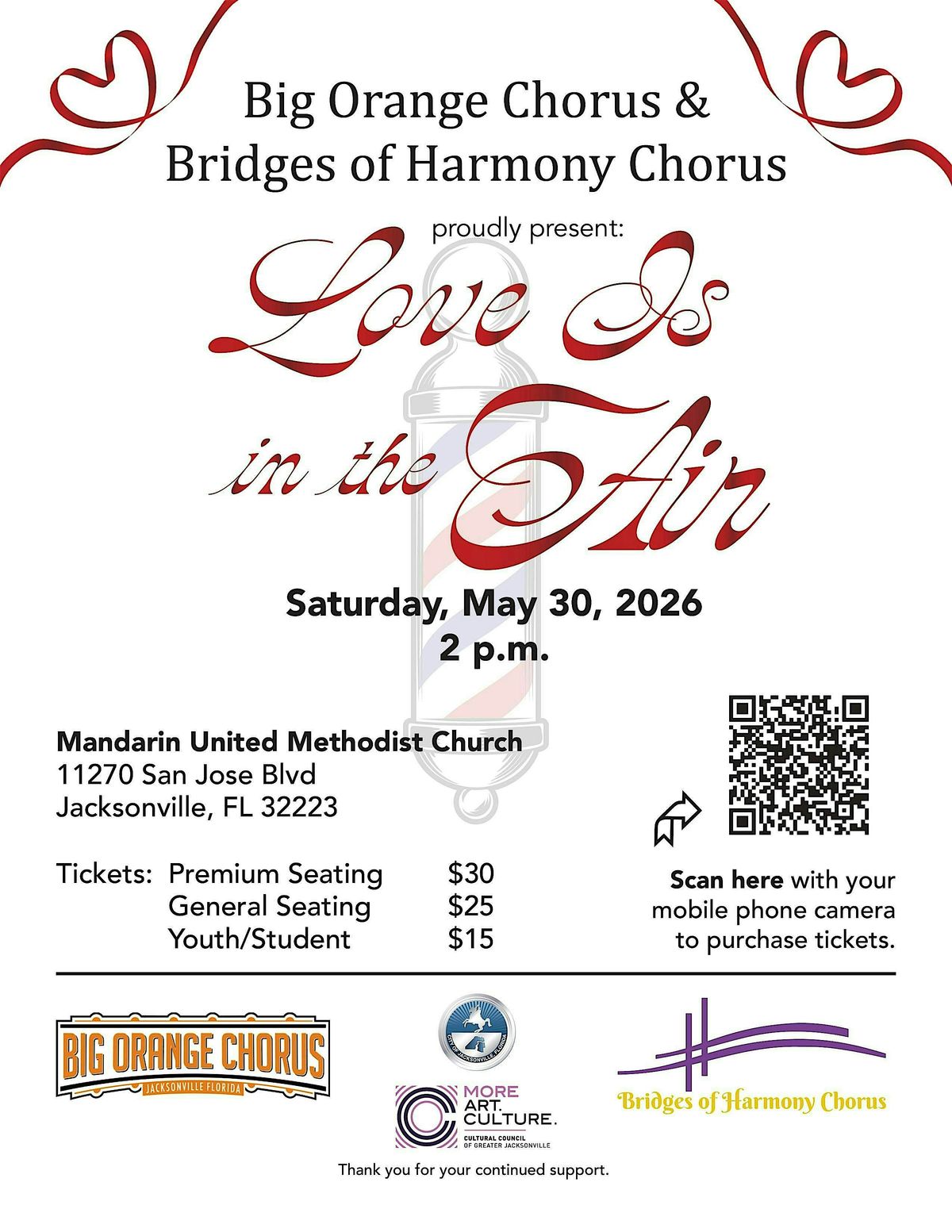 Join us for "Love Is in the Air" presented by the Big Orange Chorus and Bridges of Harmony. This performance will be an afternoon filled with rich harmonies and heartwarming barbershop to celebrate love in all of its forms.