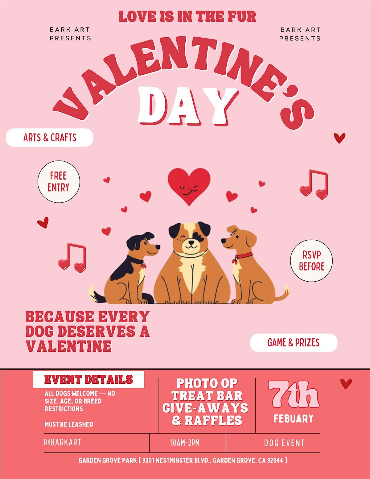 Join us for a Valentine’s-themed outdoor dog event , for dogs to socialize, participate in creative arts and crafts, and enter raffles ❤️About this Event