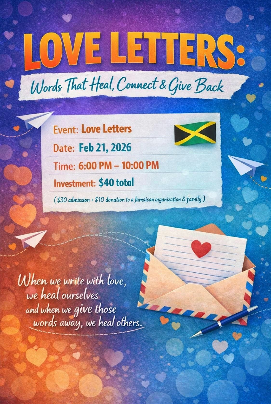 Love Letters is a heart-centered experience where you will write a love letter to yourself affirming your worth, strength, and resilience while also creating letters of hope and encouragement for Jamaicans of all ages. Together, weโll take part in a collective act of giving through words and intentional donation.