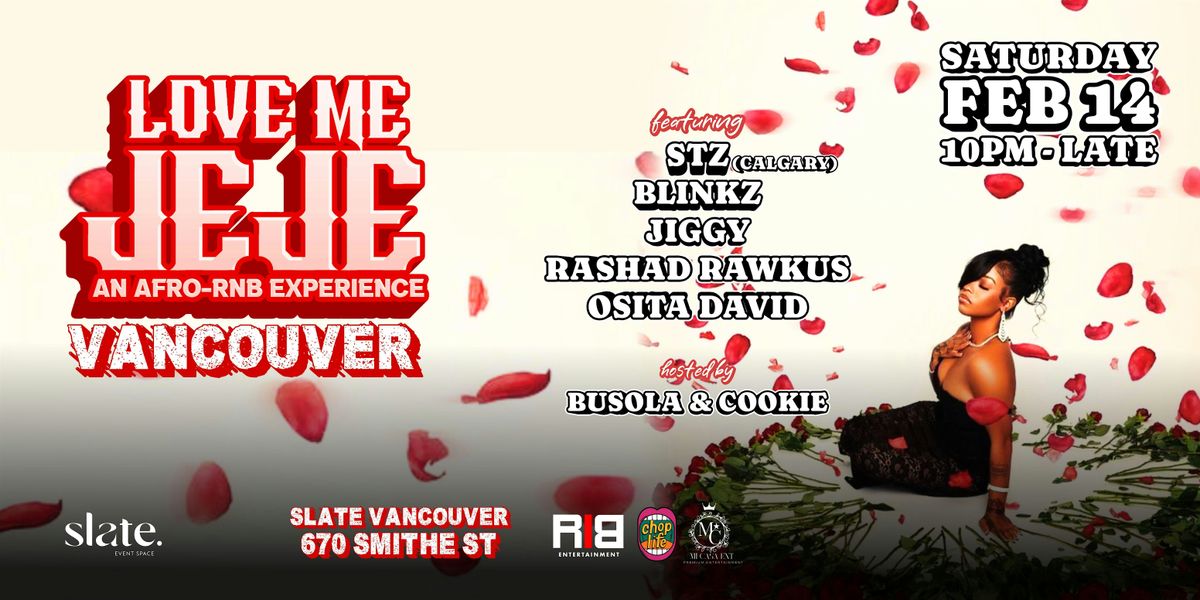 Welcome to LOVE ME JEJE: AN AFRO-RNB EXPERIENCE VANCOUVER happening at slate. Event Space on February 14, 2026 at 10:00 PM Pacific Time (PST). Get ready for a night filled with soulful Afro-RnB vibes that will make your heart sing! Let's celebrate love, music, and good vibes together. Don't miss out on this unforgettable experience!