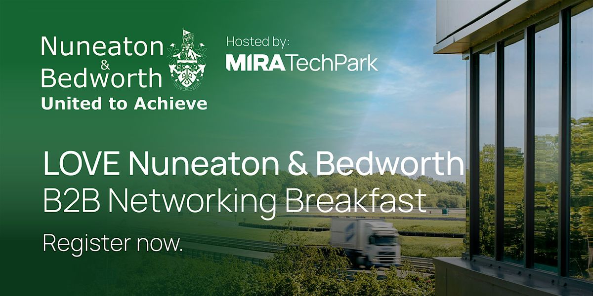Join us for the LOVE Nuneaton & Bedworth B2B Networking Breakfast, bringing together local businesses, partners, and community leaders to celebrate success, explore collaboration, and champion economic growth across our region. You’ll hear regional updates, connect with other local business leaders, and discover opportunities to engage with the MIRA Tech Park App Marketplace - a digital platform designed to promote local businesses to our growing ecosystem of over 40 occupiers.