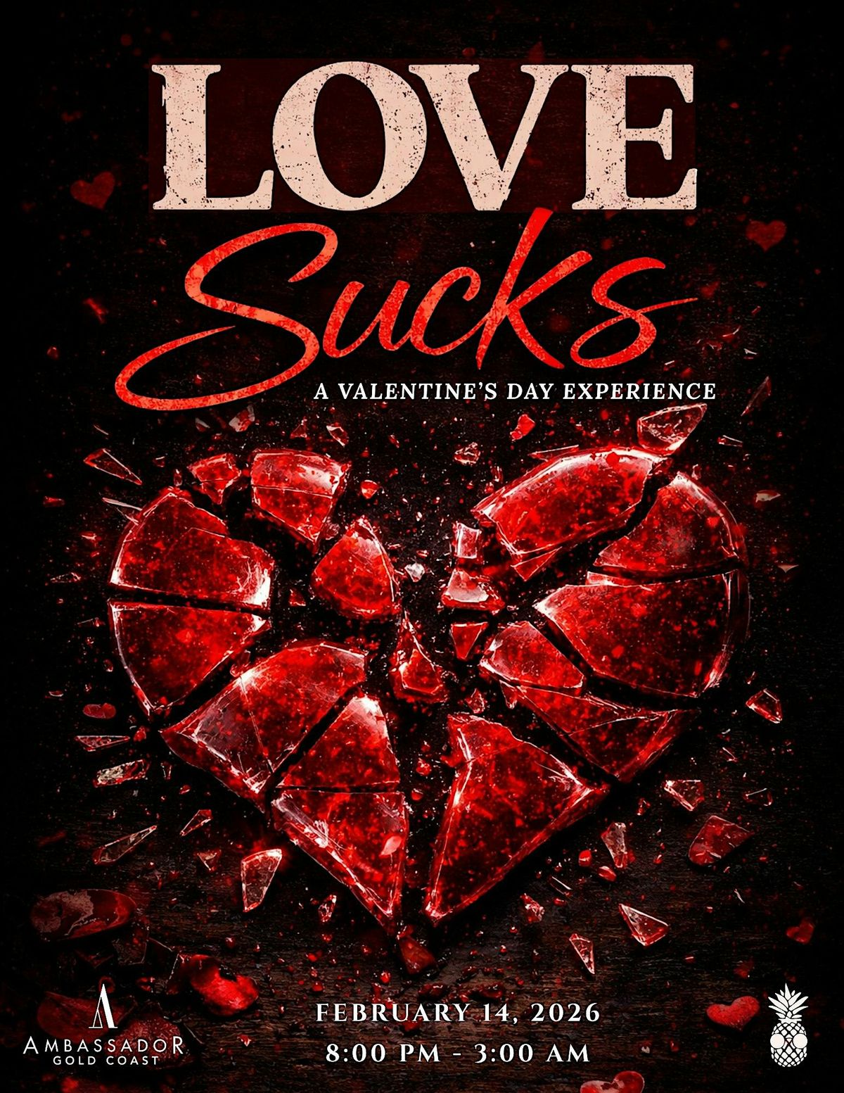 This Valentine’s Day, skip the forced romance and join us at the Ambassador Room for Love Sucks. A night for the heartbroken, the happily single, the emotionally unavailable, and everyone tired of first dates that go nowhere.