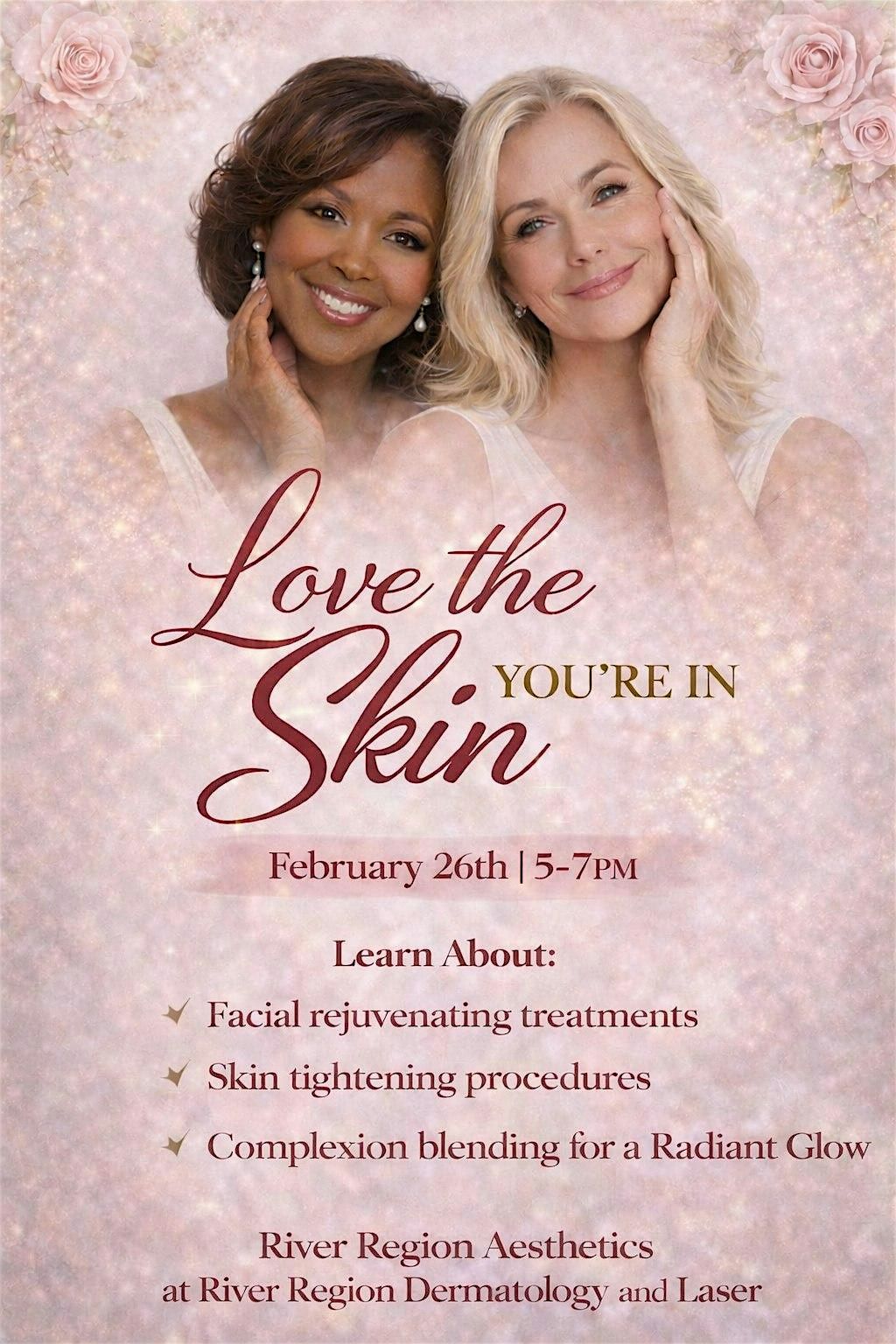 Join us for Love the Skin You're In, an exclusive evening focused on enhancing your natural beauty, elevating your confidence, and boosting your self-love. Guests will learn about advanced treatments designed to refresh and restore the skin, including options for facial rejuventation, complexion blending, and skin tightening. Enjoy light refreshments, hear real patient testimonials, and discover personalized solutions to help achieve a smoother, more radiant, and youthful glow in a relaxed, welcoming ambience.