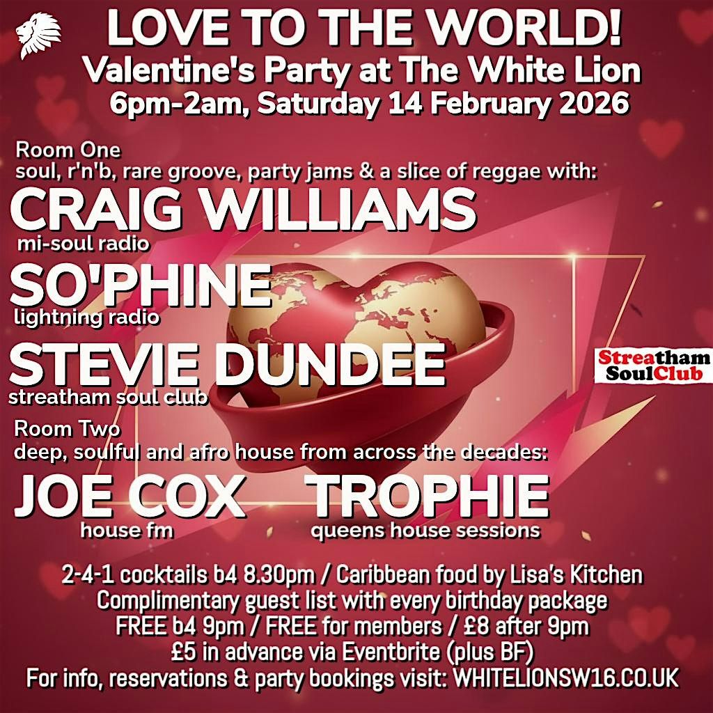 LOVE TO THE WORLD PRESENTS the big Valentine's party on Saturday 14th February. Two rooms of music until 2am.