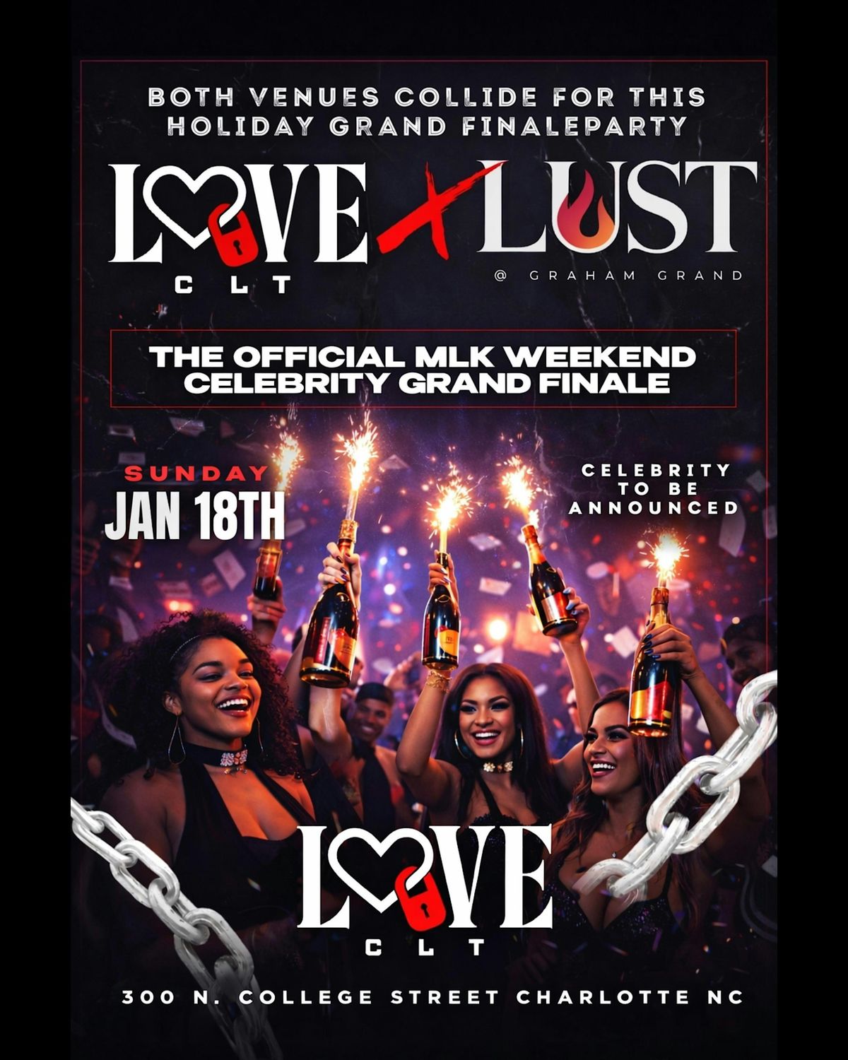 Two of Charlotte’s biggest powerhouses LOVE CLT and LUST @ Graham Grand collide for the Official MLK Weekend Celebrity Grand Finale — the biggest Sunday night of the holiday!