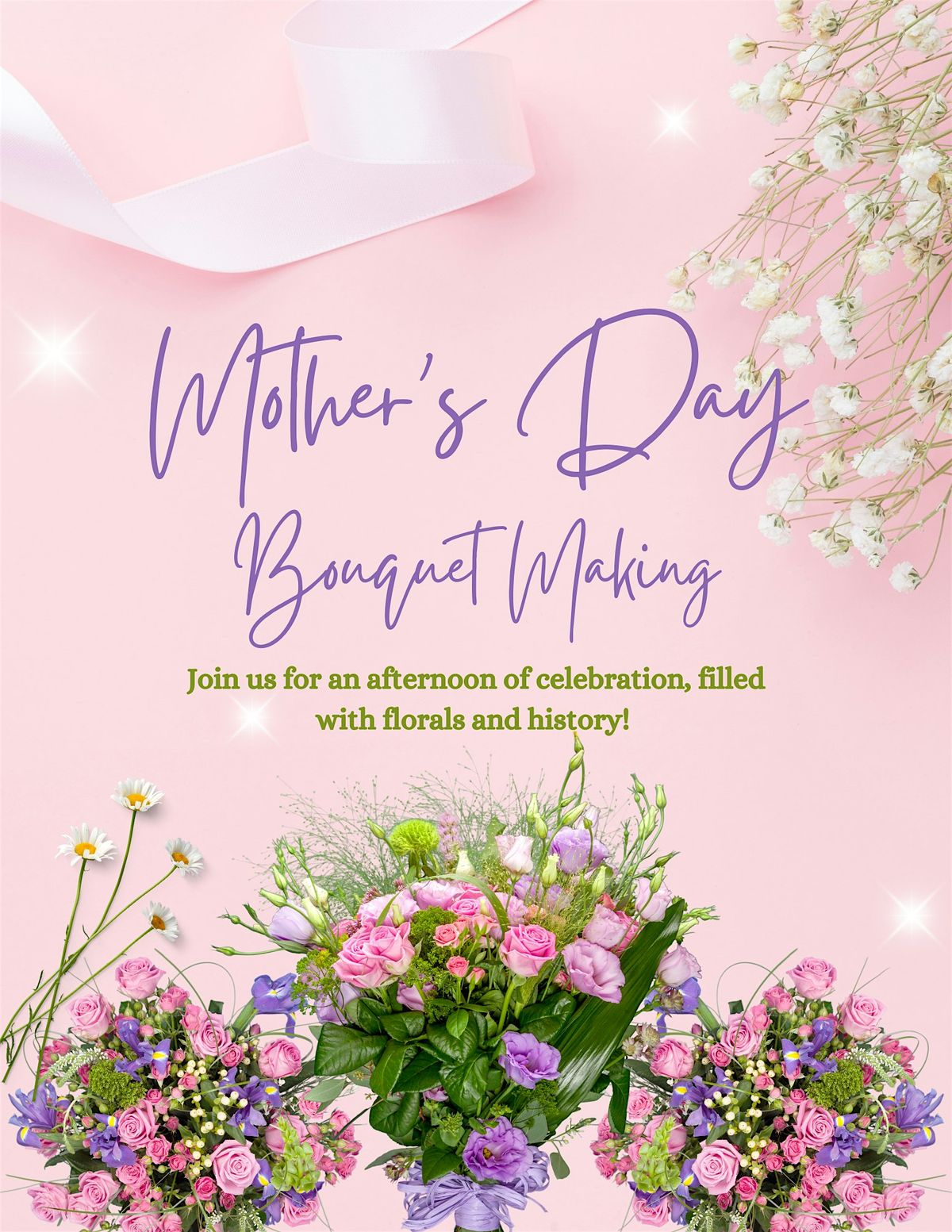 Celebrate Mother's Day surrounded by nature, florals, and feminine history. The two hour event will include a mini-lecture on Victorian Flower Language, followed by a boquet making workshop. Participants will choose focal flowers, filler flowers, greenery, and wrapping materials to create their unique arrangements. Alongside the lecture and workshop, light refreshments will be provided.