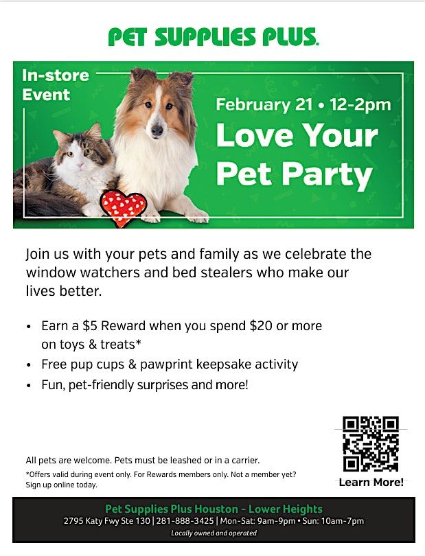 Welcome to the Love Your Pet Party happening at Pet Supplies Plus Houston - Lower Heights on February 21, 2026 at 12:00 PM (Central Time)! 🐾