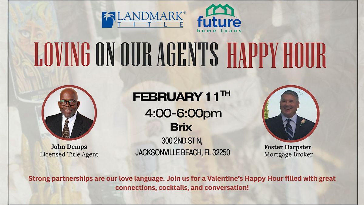 Welcome to the Loving on our Agents Happy Hour event! Join us at Brix on February 11, 2026, at 4:00 PM for a fun evening of appreciation. Sponsored by Landmark and Future Home Loans!