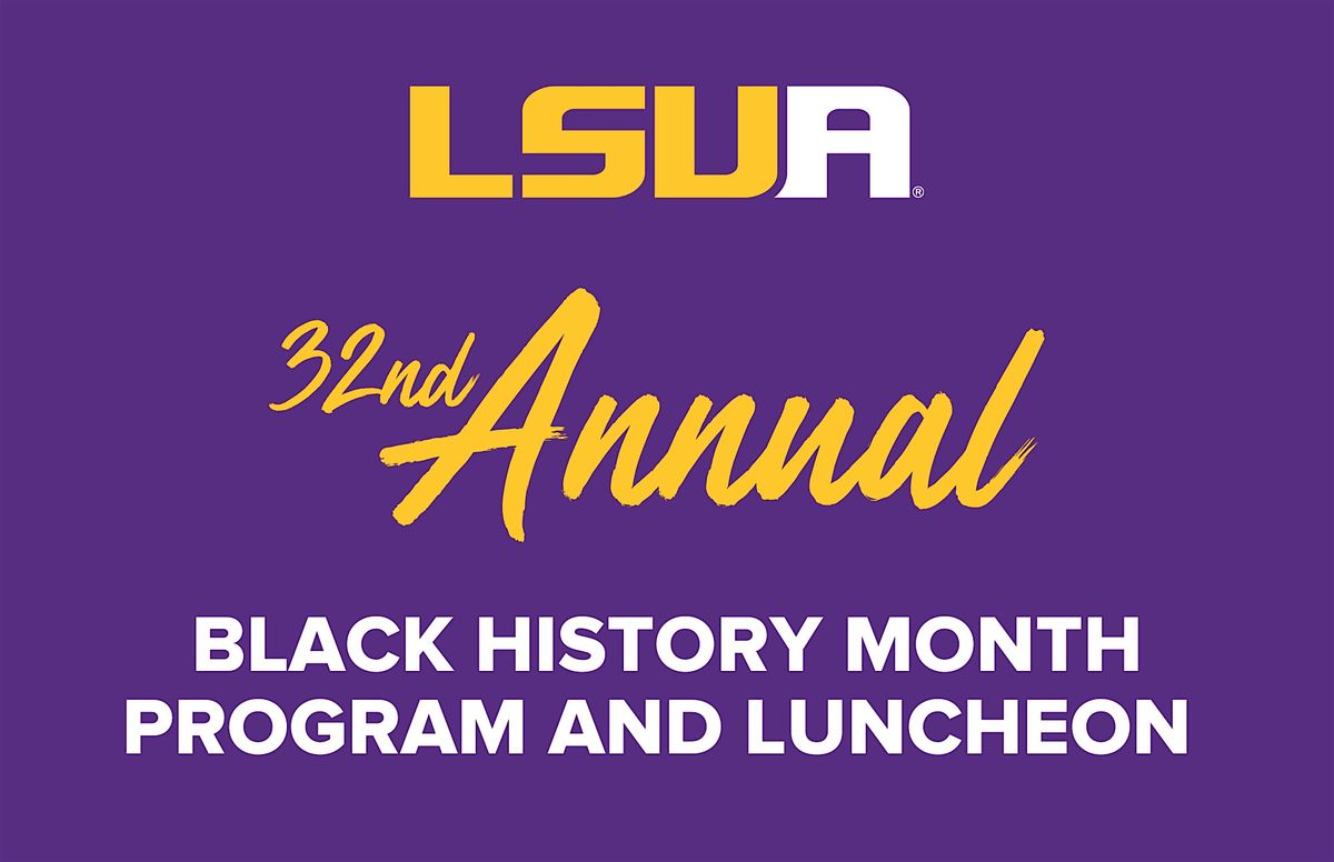 Please join us for the LSUA 32nd Black History Month Program and Luncheon, an in person experience centered on engagement, community, and shared humanity. Don’t miss out on this special event. Come be a part of this inspirational moment. All are welcome to attend and participate. Doors will open at 11:30 a.m. with the program beginning at 12:00 p.m. The event location is the LSUA AG Center/Evac Center located at 8125 Highway South, Alexandria, LA. The registration price shown reflects the total price, incuding Event Brite service fee.
