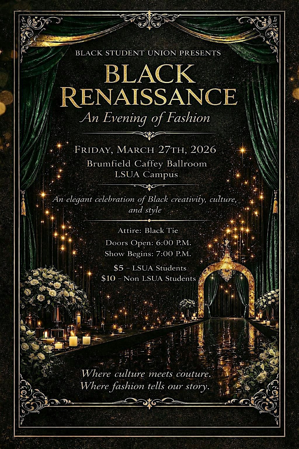 Get ready for an epic night celebrating style and culture at the Black Renaissance Fashion Show hosted by LSUA BSU! This in-person, Black Tie event is all about showcasing bold designs, creativity, and Black excellence. Come through and witness fashion that tells a story. Don’t miss out on this unique experience filled with energy, art, and community love.