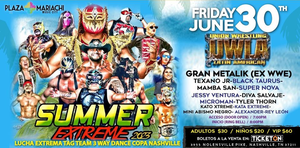 Join us for the thrilling "Summer Extreme 2023", a Lucha Libre spectacle at Plaza Mariachi on Friday, June 30, 2023. Witness the color, acrobatics, and drama of UWLA's finest Lucha fighters, as they battle starting at 8 PM. Doors open at 7 PM. Adult tickets cost $30, children $20, with VIP available at $60, promising an unforgettable experience. Purchase your tickets at Mazfresco Market or online at ticketon.com. Let the summer begin with high-flying maneuvers, mask-clad warriors, and heart-stopping action!
