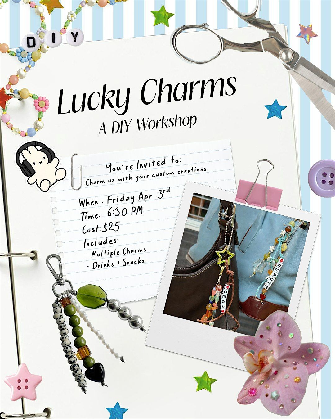Join us for a fun and creative afternoon designing your own custom accessories! At our Charm Workshop, you’ll get to create unique pieces using a variety of beads and charms.