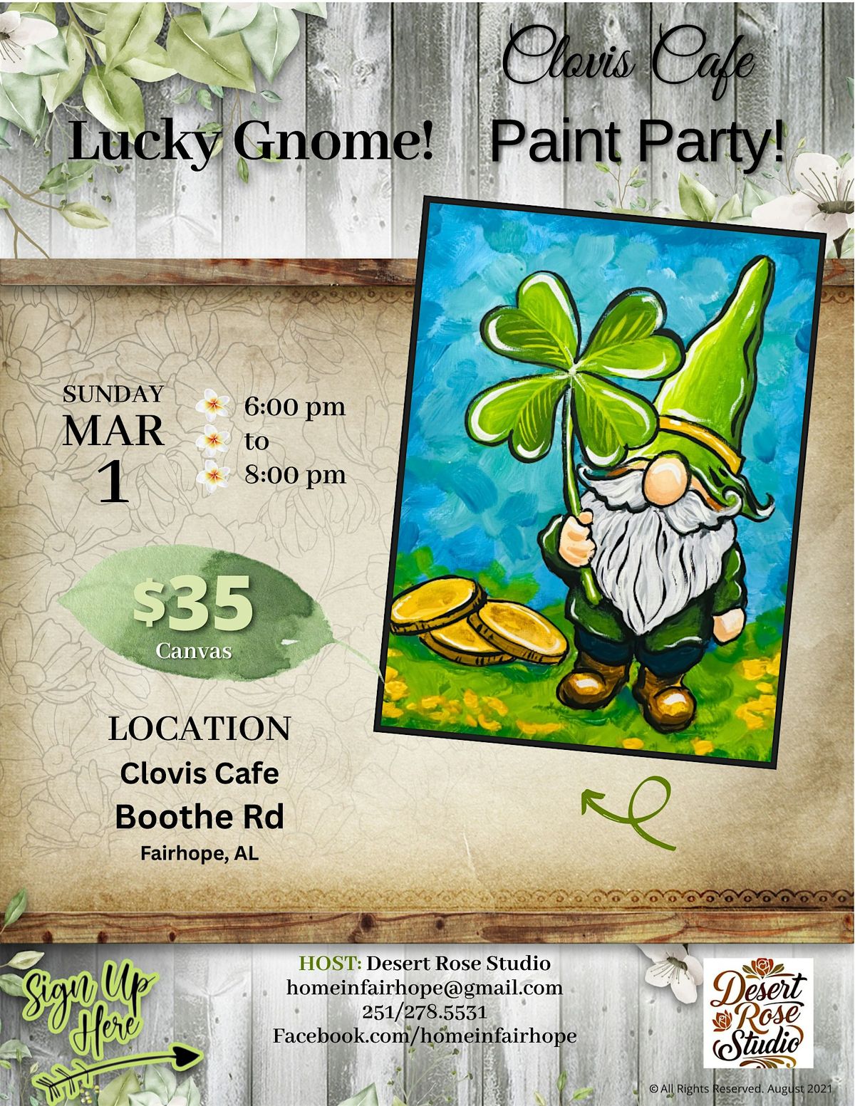 Join us for a fun Lucky Gnome Paint and Sip Party at Clovis Cafe—paint, sip, and good vibes!About this Event