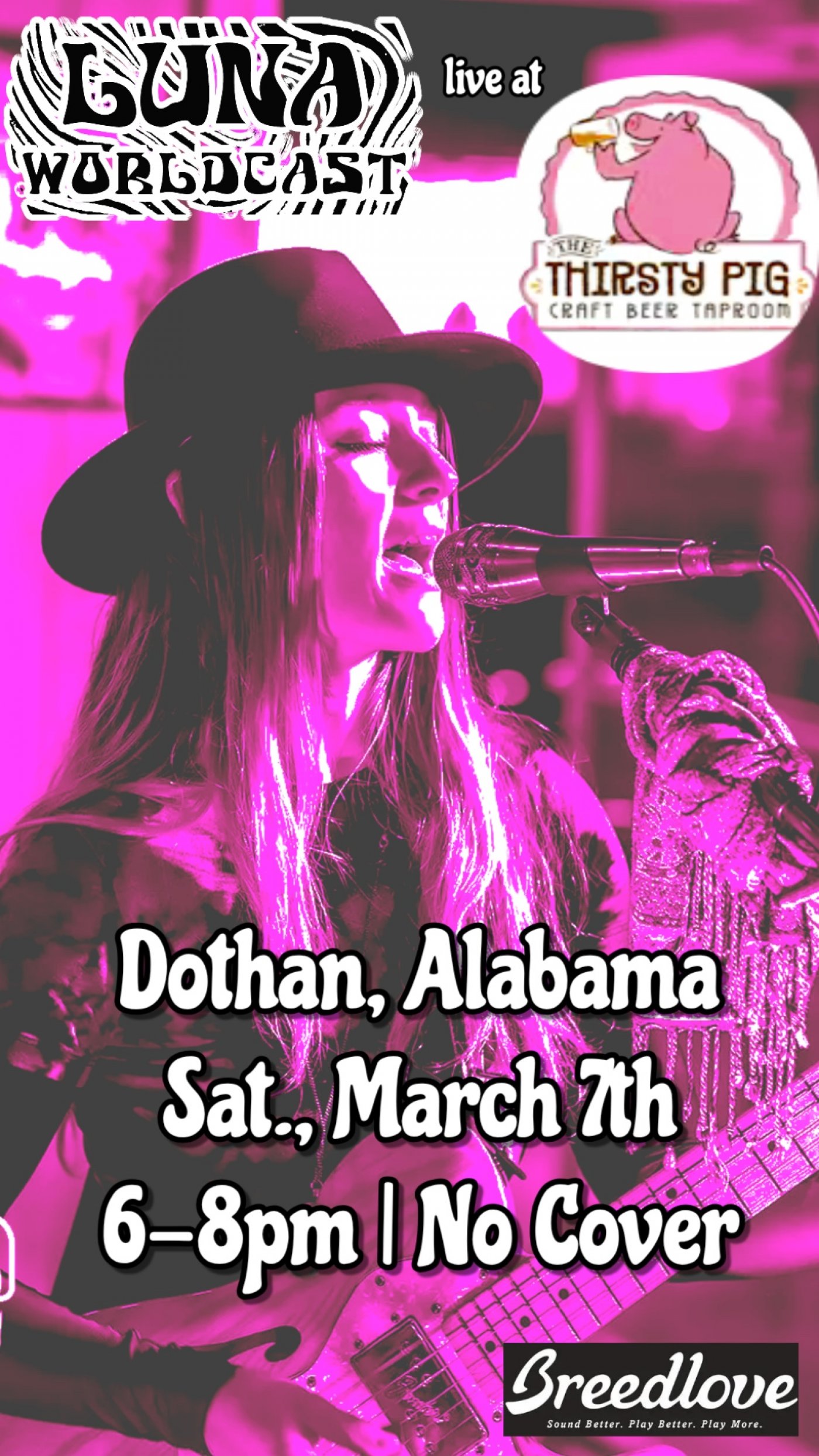 With a repertoire consisting of 3 hours of original unpublished music, as well as 3 hours of covers, her far out sound is a good fit for the Thirsty Pig!