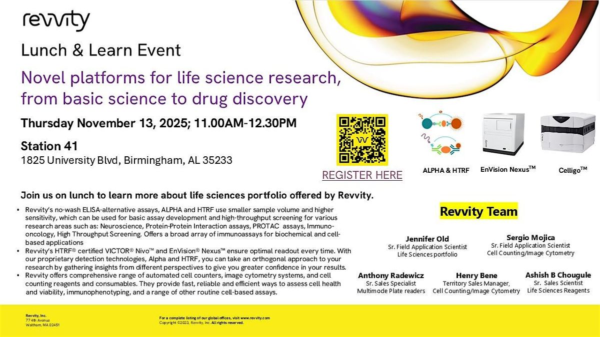 Revvity (previously affiliated with PerkinElmer, Inc.) is a visionary partner in developing technologies and solutions to help solve the world’s greatest health challenges. Revvity offers wide range of technologies and instrumentation such as drug discovery reagents, microplate readers, automated cell counters, in vivo imaging etc for different life sciences research fields. In this Lunch and Learn event, Revvity team will be presenting on a topic “Novel platforms for life science research, from basic science to drug discovery.” The presentation will cover following topics