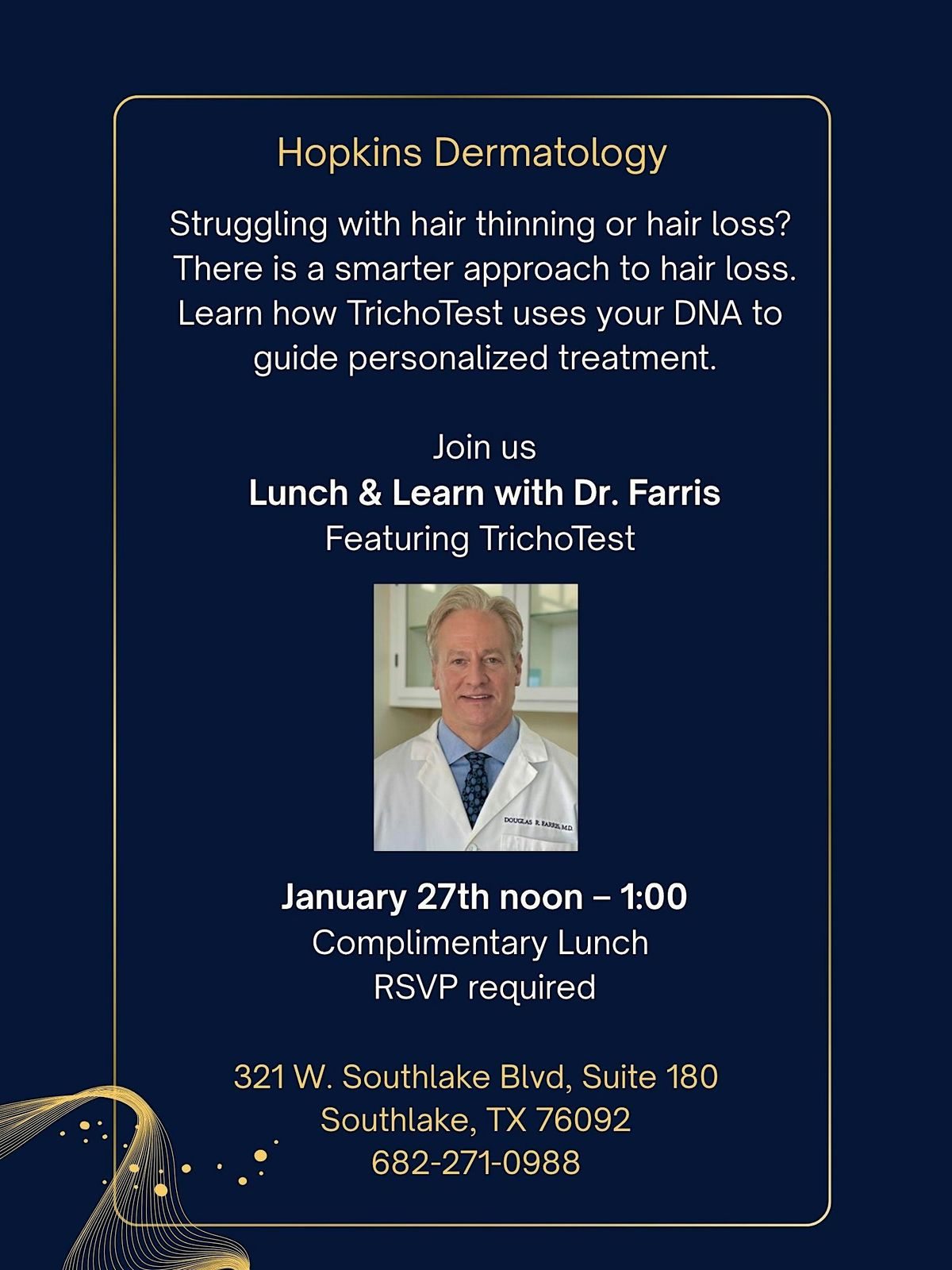Join us for an informative Lunch & Learn with Dr. Farris as we explore TrichoTest™, an advanced genetic test designed to help identify the most effective, personalized treatments for hair loss.