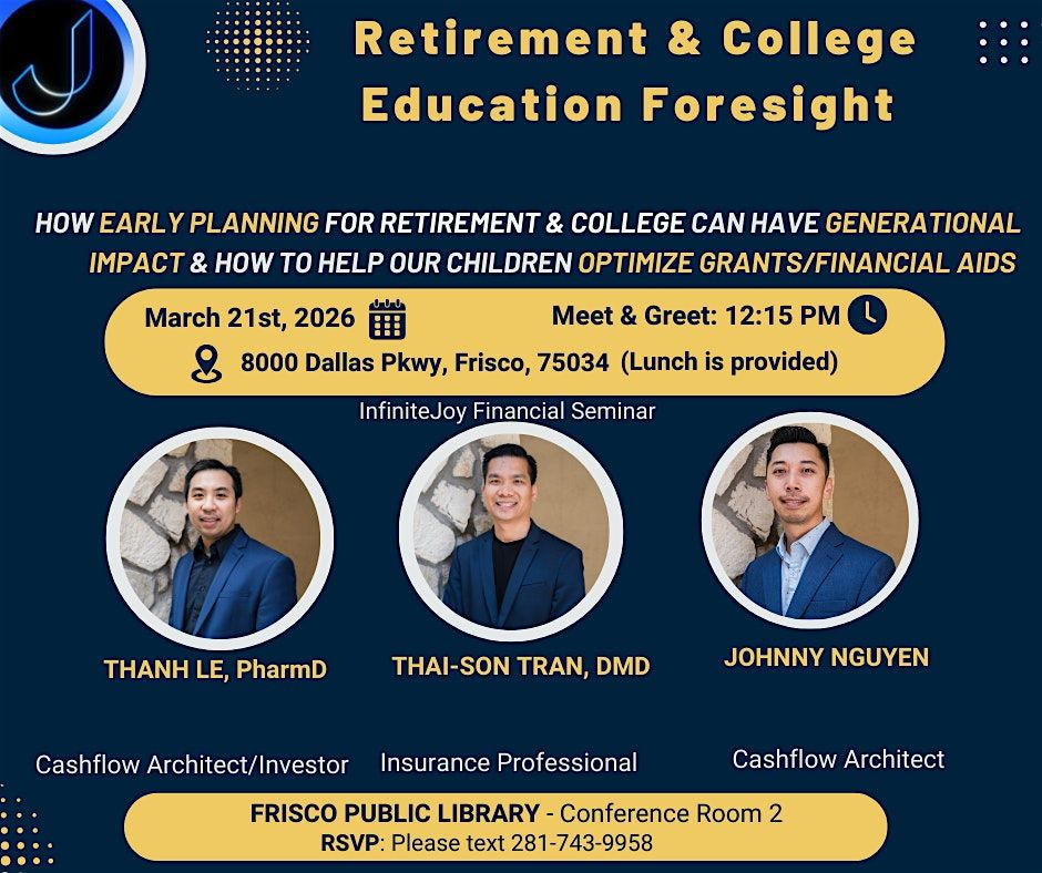Ready to secure a brighter future for your family? Our in-person event digs into efficient strategies for tax-free retirement planning and education planning for your kids, including how to optimize grants, scholarships and financial aids. Come hang out, learn cool tips, and get ahead with your finances. Don't miss this chance to plan smart and early!