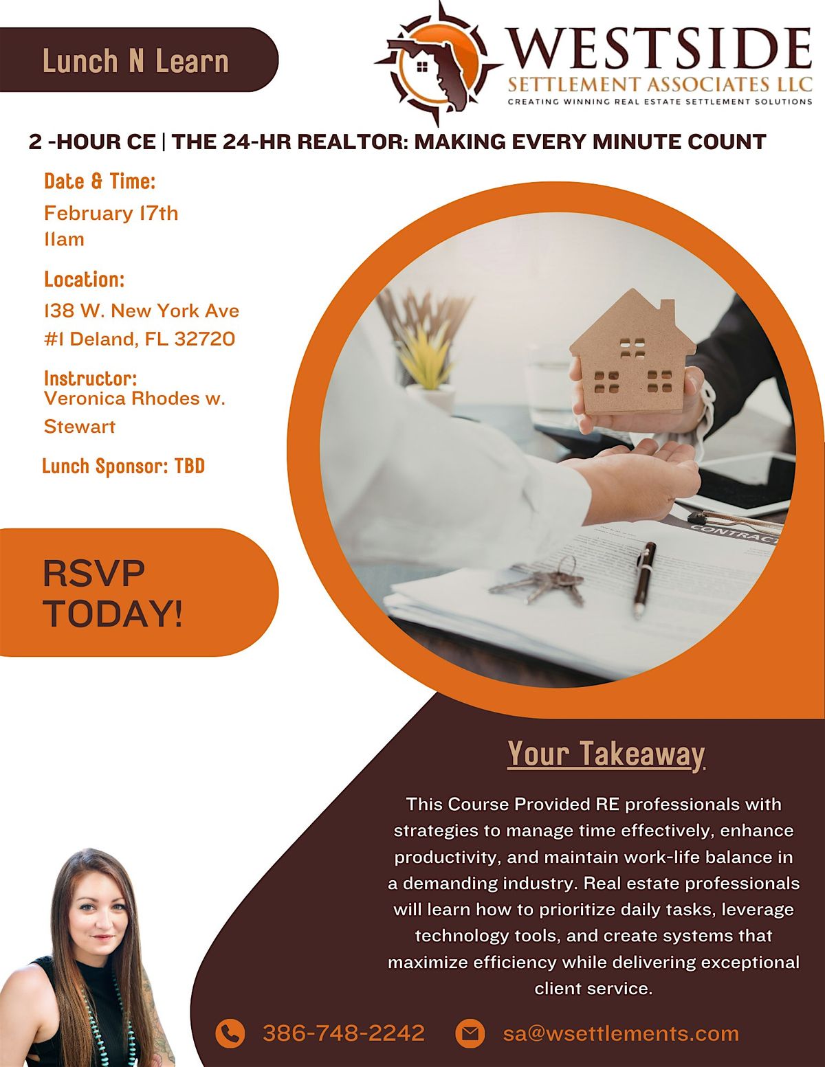 Join us for a FREE 2-hour Continuing Education (CE) Lunch & Learn designed specifically for today’s busy real estate professionals. In The 24-Hour Realtor: Making Every Minute Count, you’ll gain practical strategies to take control of your time, boost productivity, and create better work-life balance—without sacrificing exceptional client service.