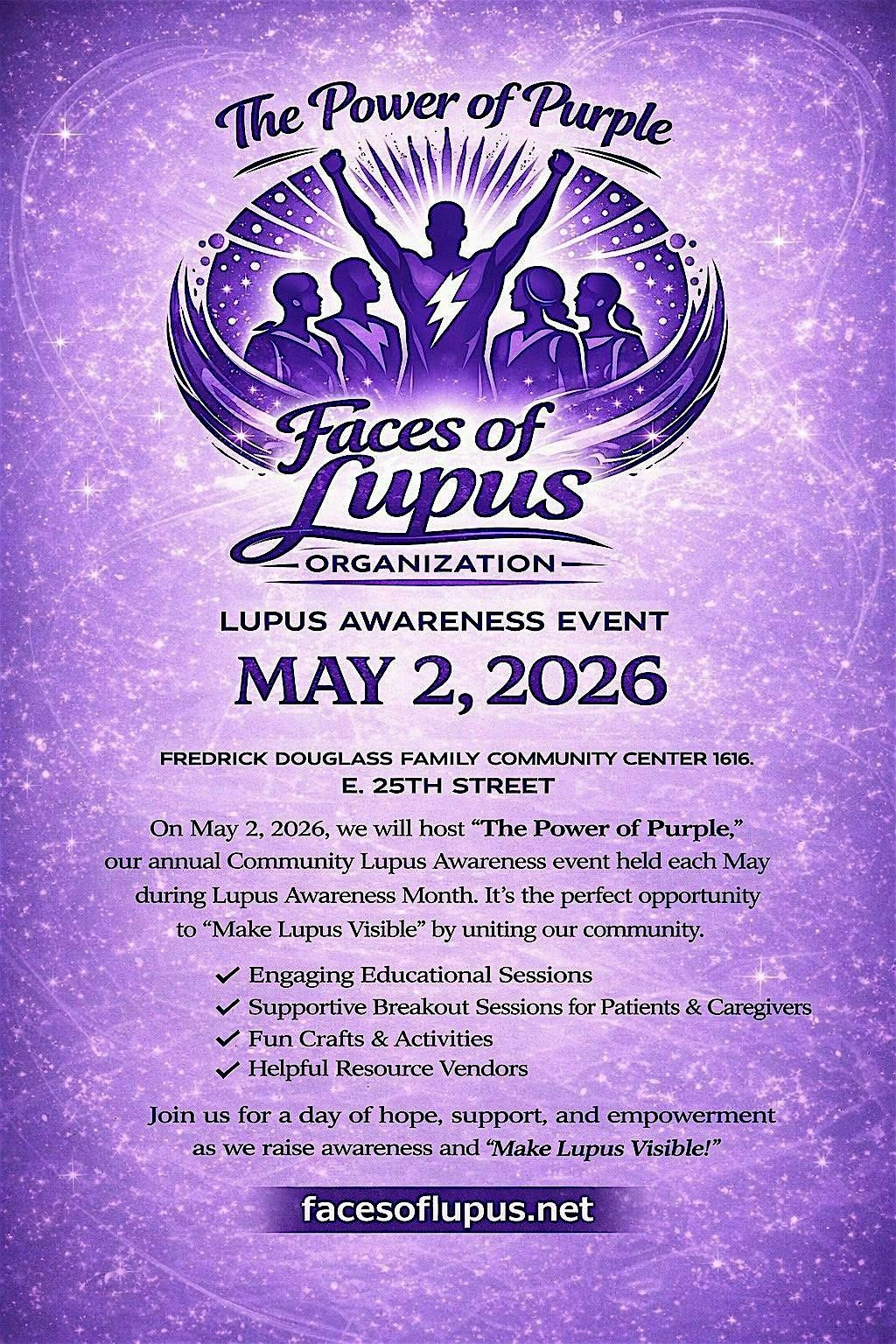 The Power of Purple is an annual community-driven Lupus Awareness event hosted by the Faces of Lupus Organization each May in recognition of Lupus Awareness Month. This empowering gathering is designed to bring individuals, families, caregivers, and the broader community together to increase awareness, provide education, and foster support.
