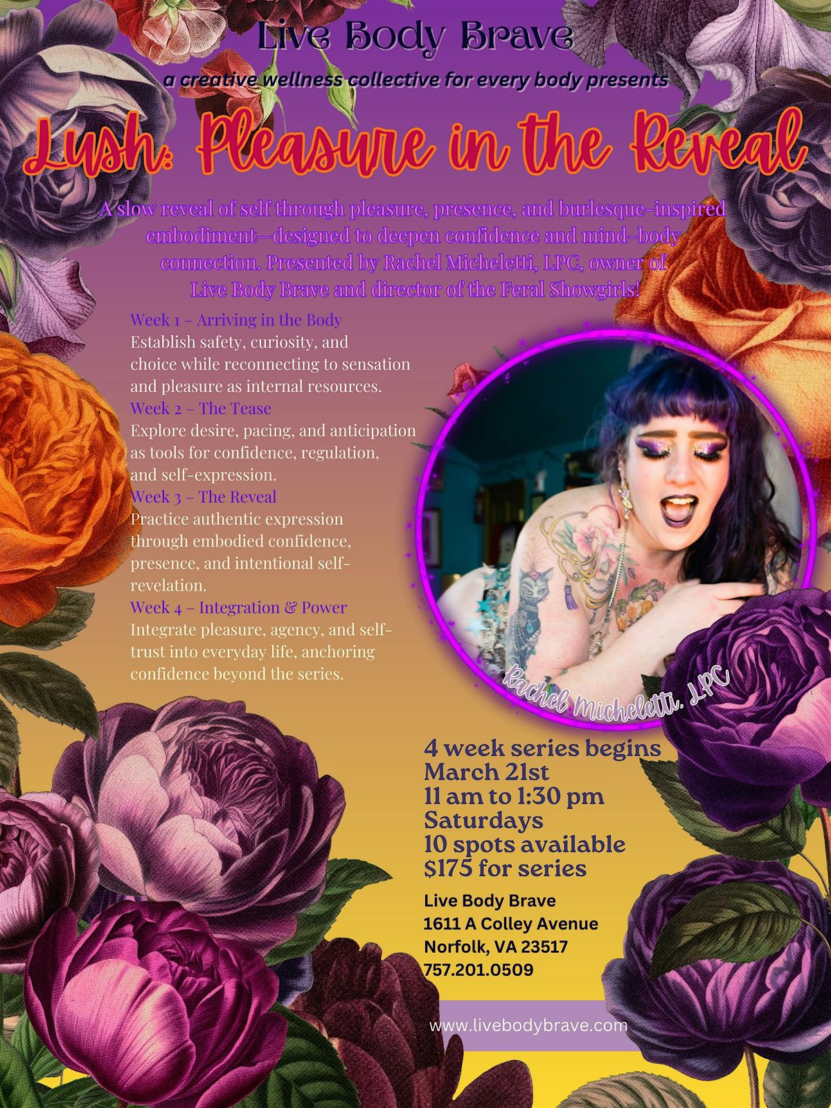 Lush: Pleasure in the Reveal is a 4-session embodied exploration of confidence, authenticity, and mind–body connection through burlesque-inspired movement and trauma-informed psychological practices.