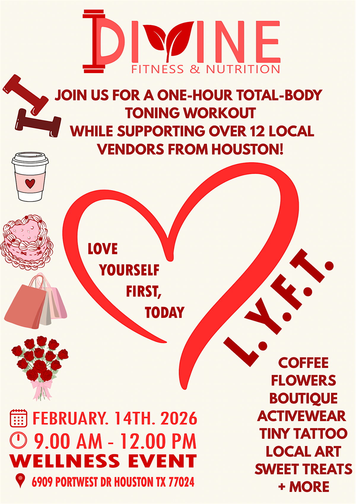 Your ticket includes a 1-hour full-body strength workout led by Divine Fitness & Nutrition, followed by access to a curated vendor space featuring local wellness brands. After the workout, enjoy shopping, photo opportunities, and a self-love letter activity.